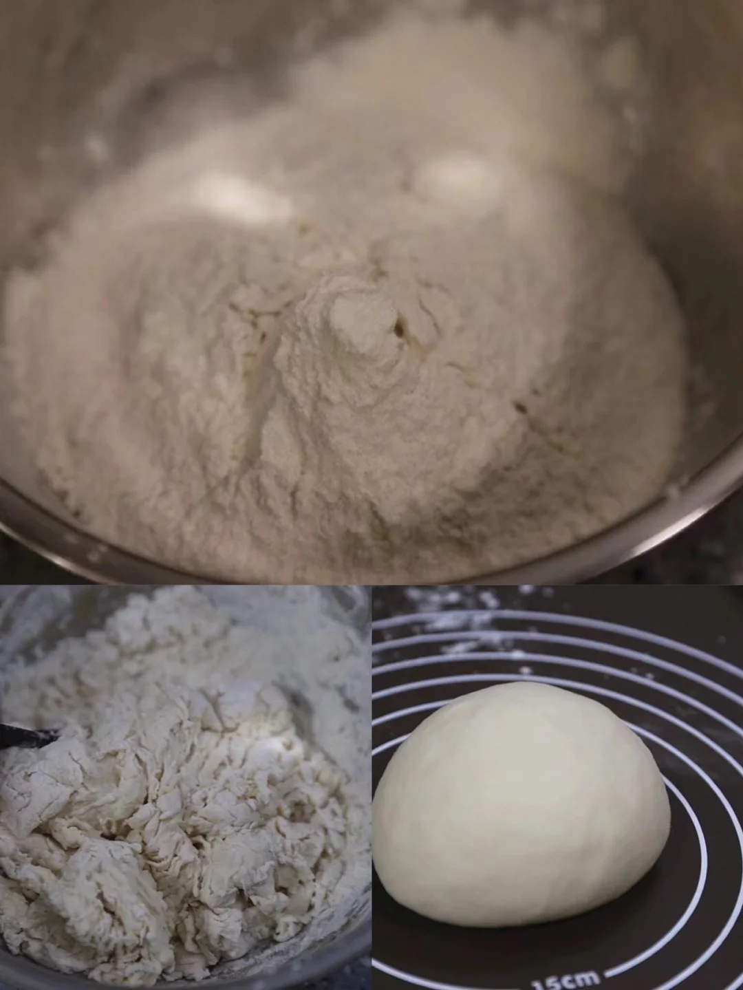 3.揉好的面团刚开始不会很光滑的,没事盖上保鲜膜醒发半个小时【但是这个期间还要继续揉两次面,让面团更有韧性也更光滑】