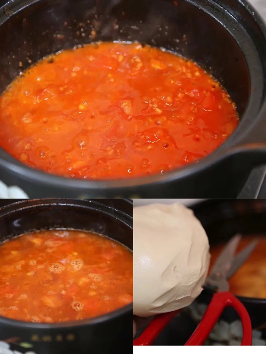 14.加入适量的水大火煮开转小火慢慢煮出味儿 15.现在我们开始来剪面啦,剪刀上抹一丢丢油,会剪得更快