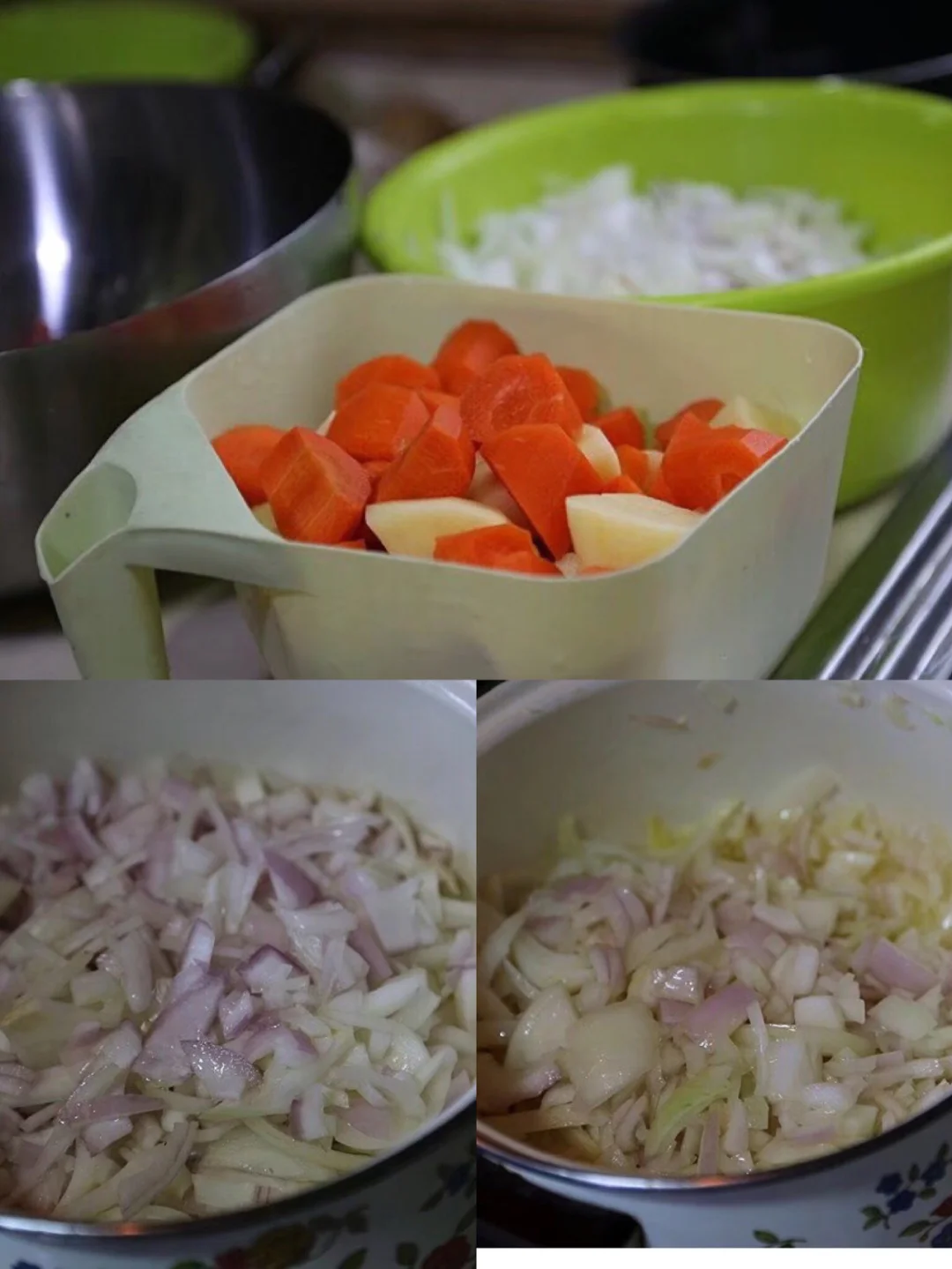 4.做的时候配料都会多做一些 因为咖喱是第二天吃越好吃的赶脚 还有汤可以拿来做咖喱面 具好吃 5.咖喱饭最好从头到尾一锅搞定是最香的 所以直接大的炖锅里炒的 锅里倒适量橄榄油【没有就一般的吧】加入洋葱丝慢慢炒