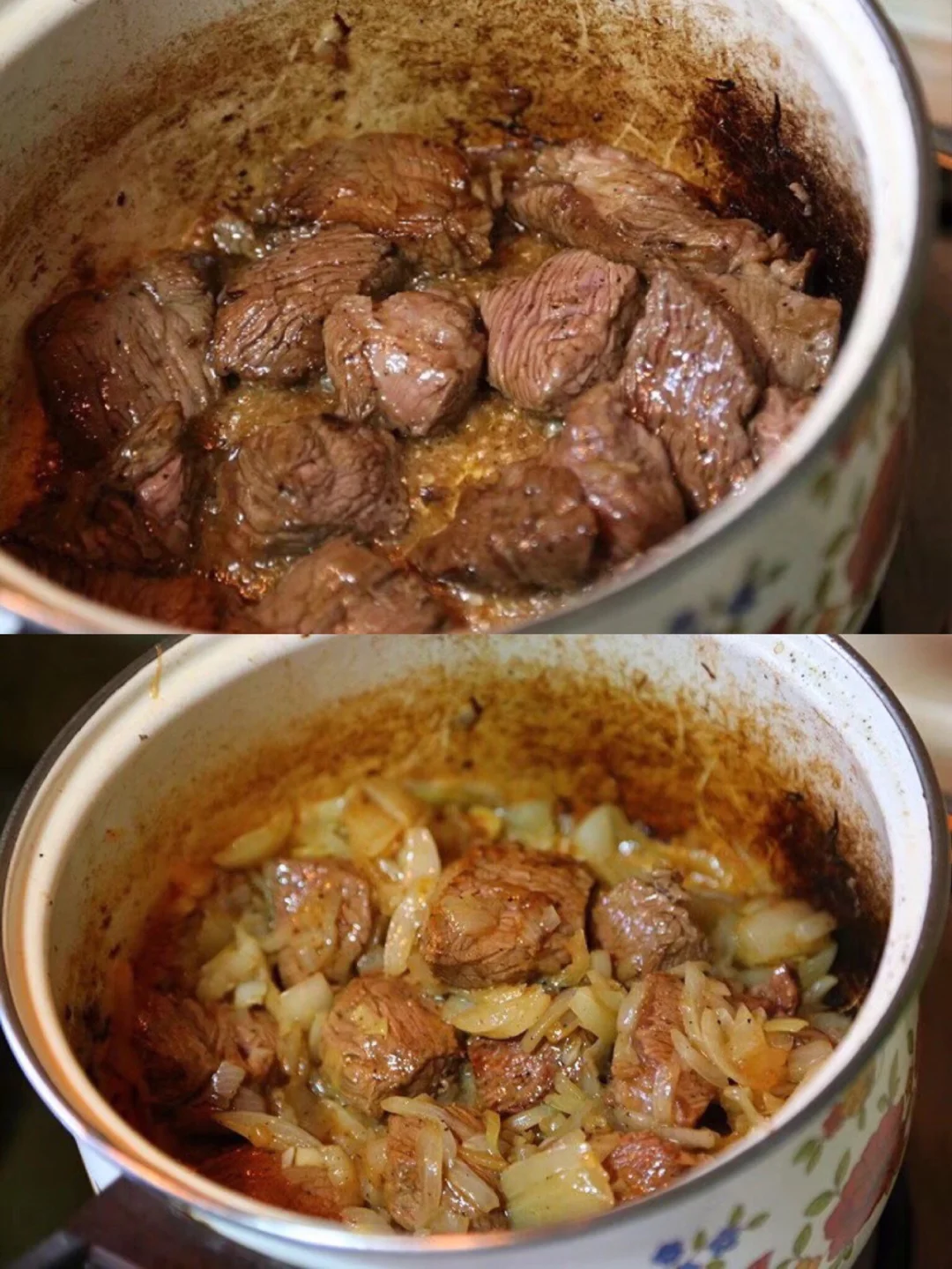 8.锅不用洗继续倒油放入牛肉块慢慢炒