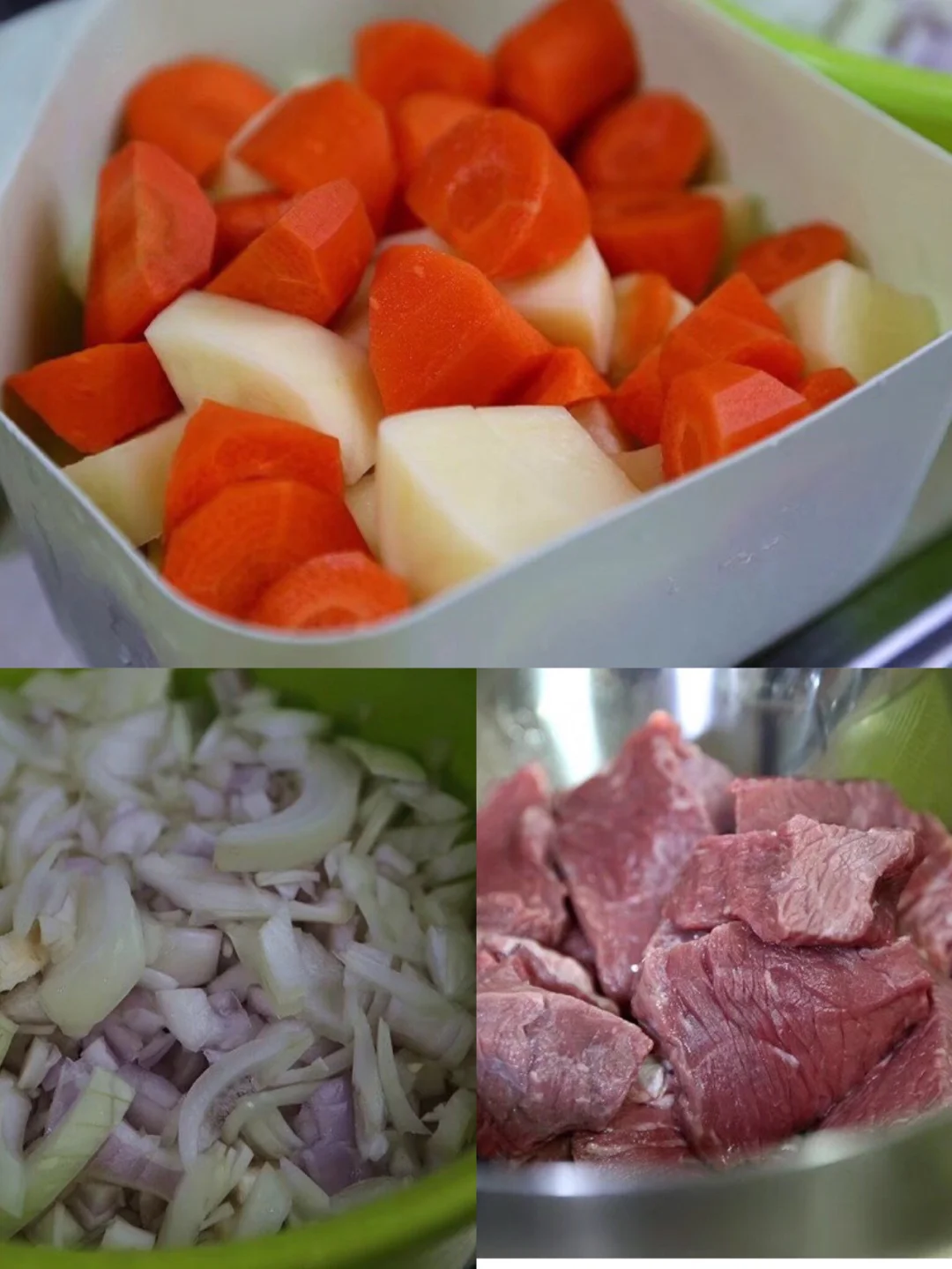 1开始准备配料: 胡萝卜和土豆都洗净削皮,切大块 因为煮的时候太小很容易全部就化掉了,