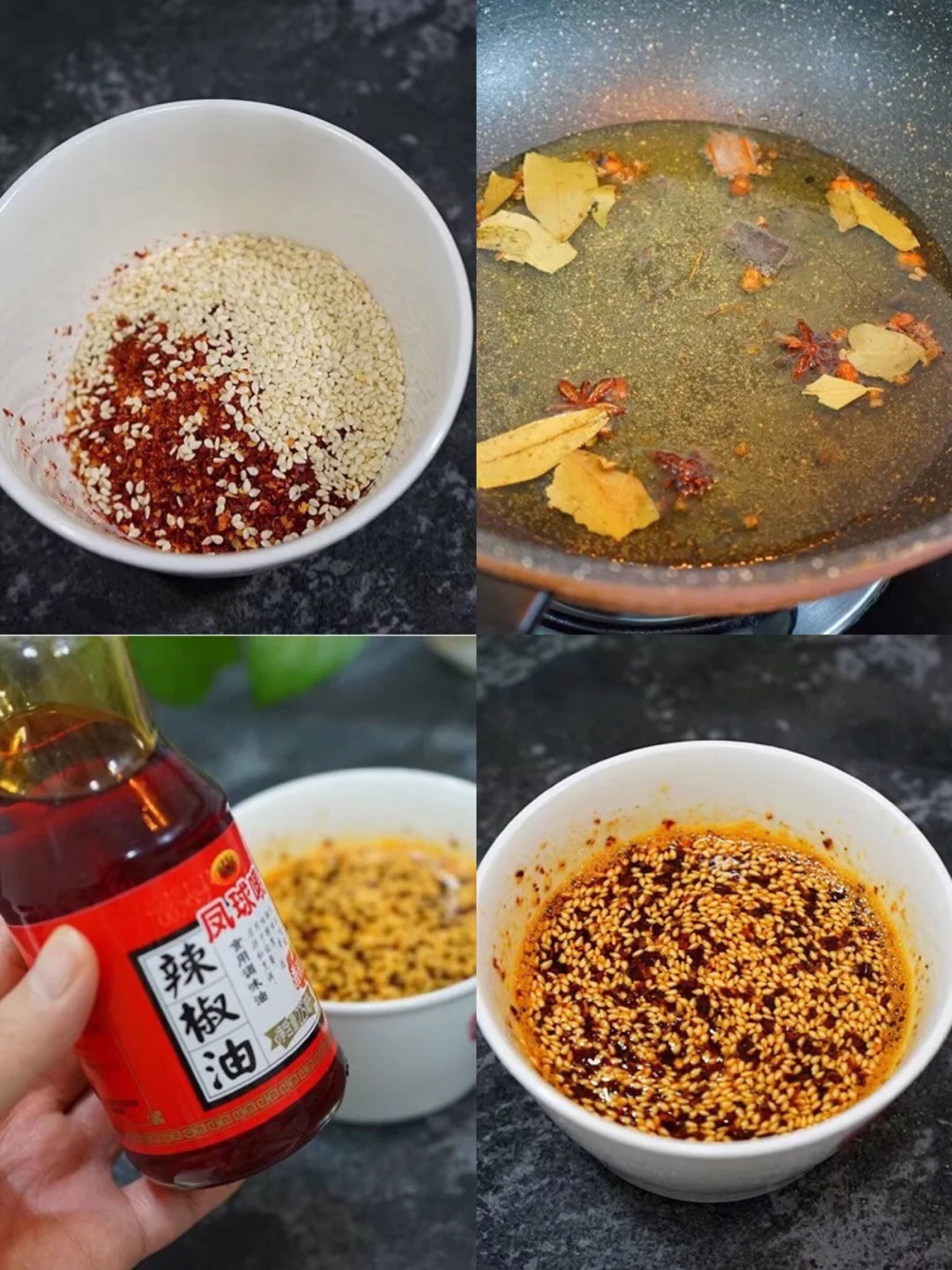 2.锅里倒入多一些的油,然后加入一些常用的香料 小火慢慢炸香,这样做出来的辣椒油味道会更好哦 3.炸好的油沥掉香料,倒入到辣椒面碗里,勺子搅拌均匀 再倒入一些买的辣椒油 颜色会更好看些 4.嗯哼辣椒油就做好啦