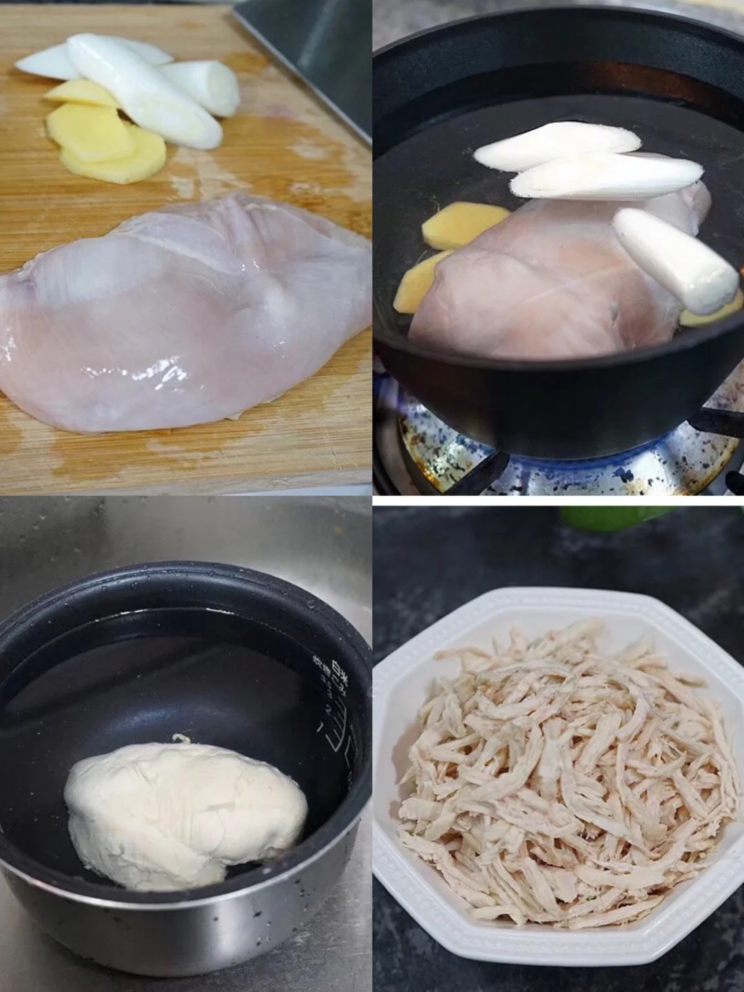 7.煮好的鸡胸肉冰水里过一下,然后耐心的撕成细丝儿,,记住顺着纹理撕,不然弄不了的