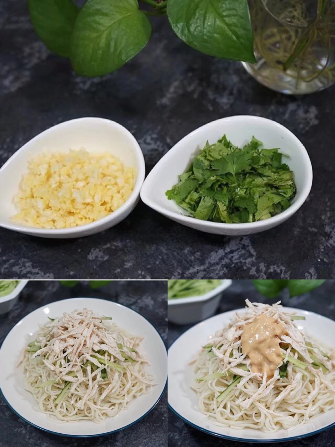 17.准备一个大盘,放入面条,弄好的鸡丝儿,黄瓜丝儿 18.加入一大勺芝麻酱
