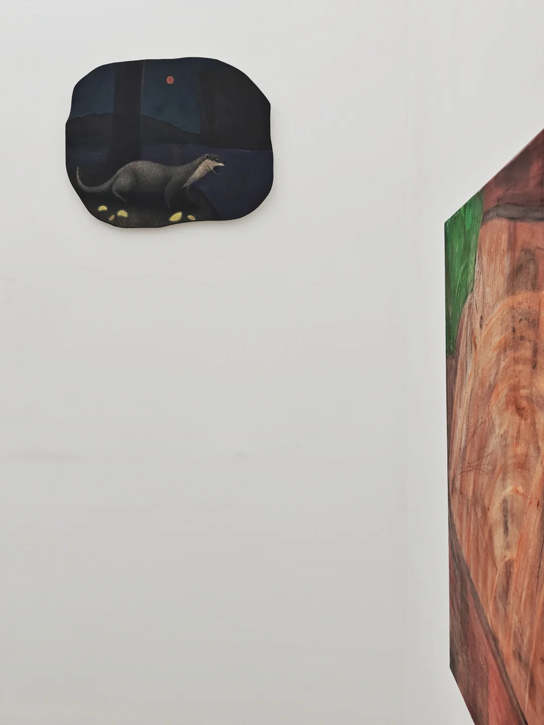 用丙烯作画,刮刀、刷子厚涂颜料。构图夸张变形。以浓烈色彩和张力构图,创奇幻场景,表达对世界的主观认知与想象。