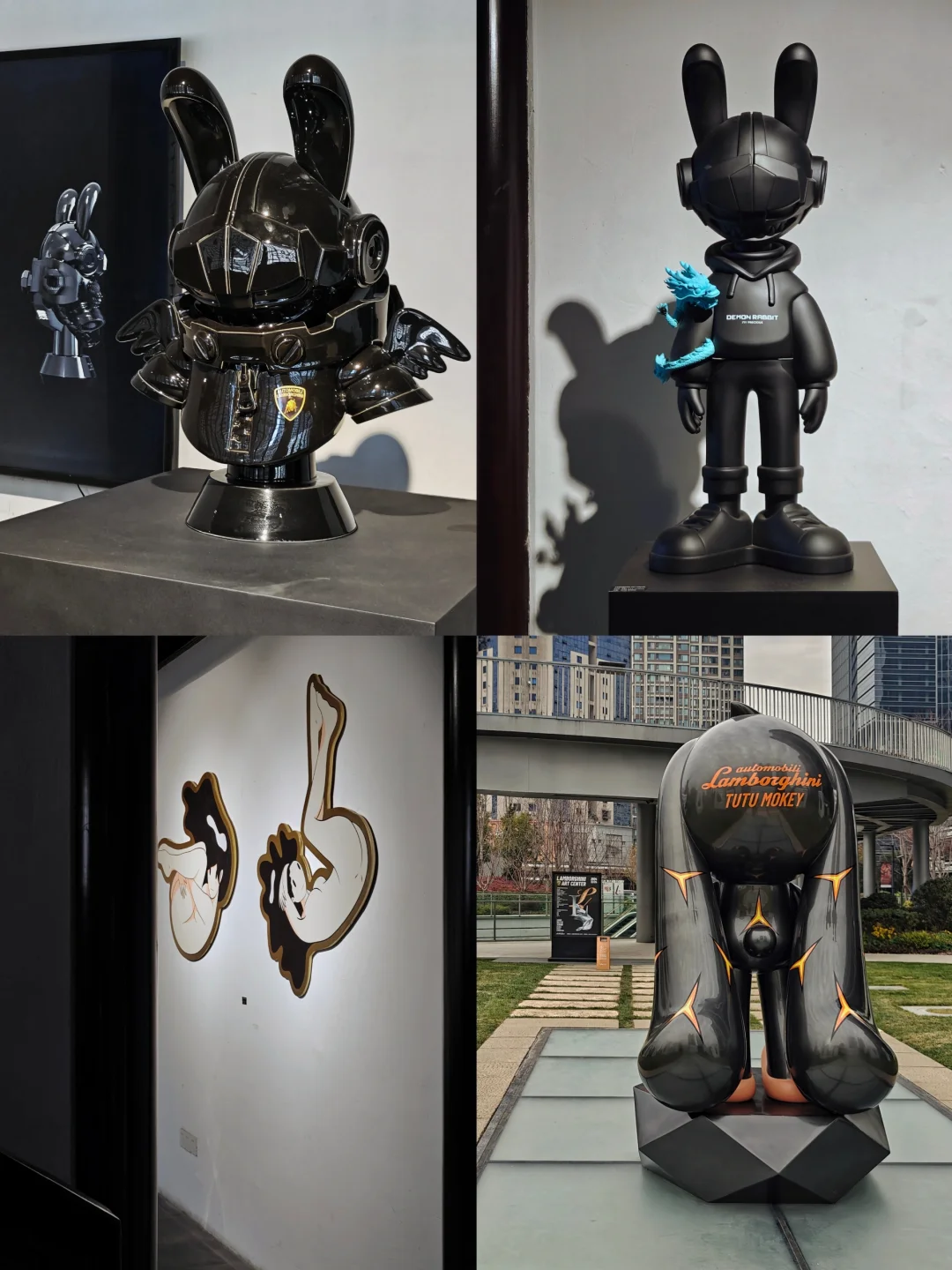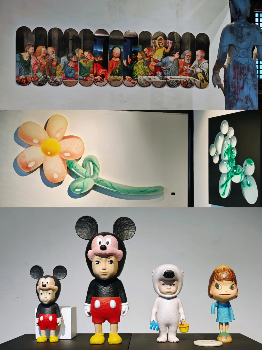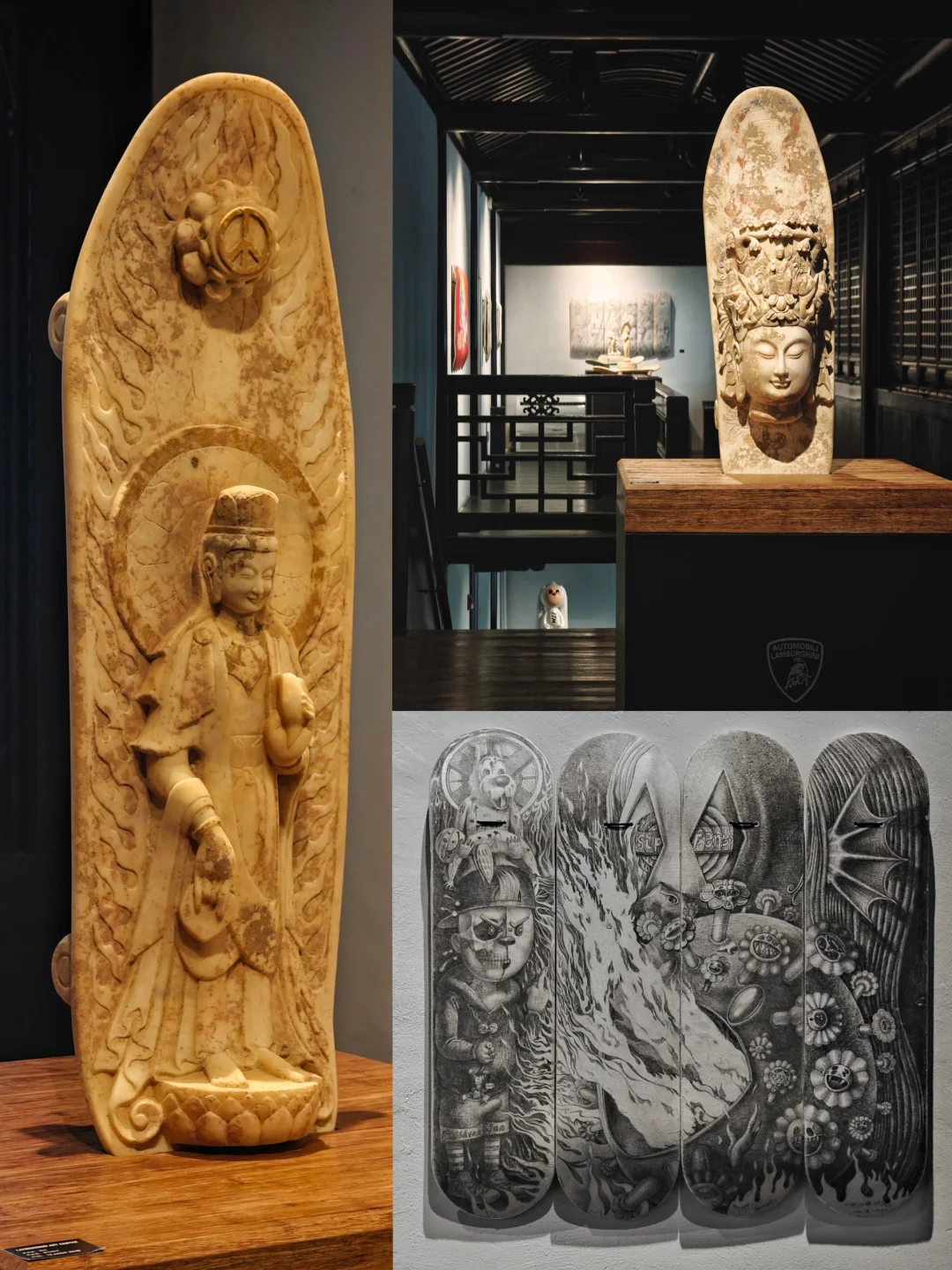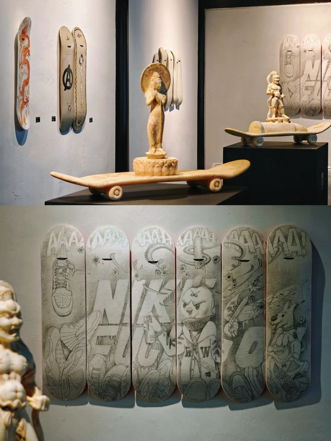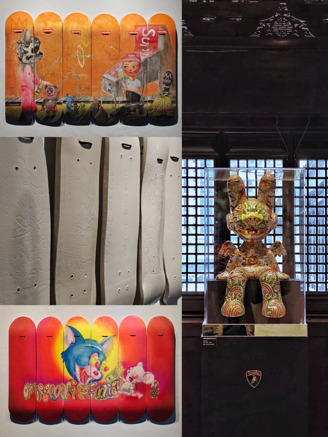 🚗展品其实分为两类,一类所谓馆藏,应该就是花钱买的,除了存疑的机械姬尺寸都不大,似乎也没什么特别珍贵的限量版(本人对潮流艺术不熟悉,懂的朋友可以来科普下),看起来都像是比较容易买到的。另一类是艺术家创作作品,其中訾鹏的作品之前在TX淮海免费展出过,草坪前那个大型的TUTUMOKEY兔极猴出自Jano.X。我觉得比较有意思的是南方的作品,他出生于邯郸,痴迷于曲阳石雕等古美术形式,他本身又是国内重要的滑板收藏家,作品都是在画板上做结合创新。
