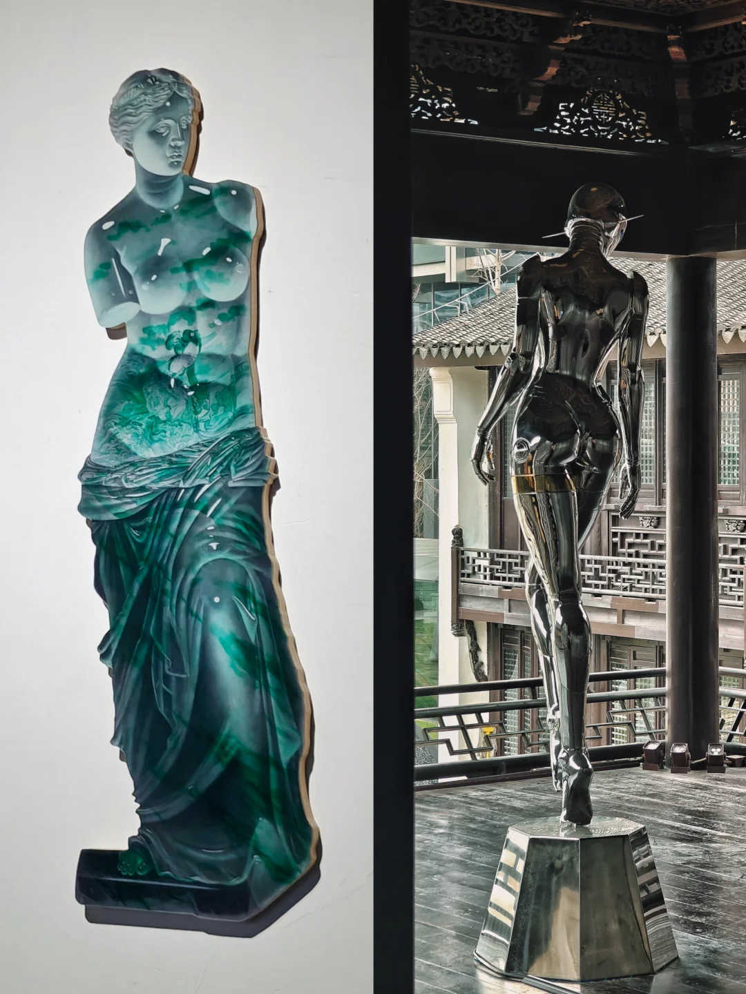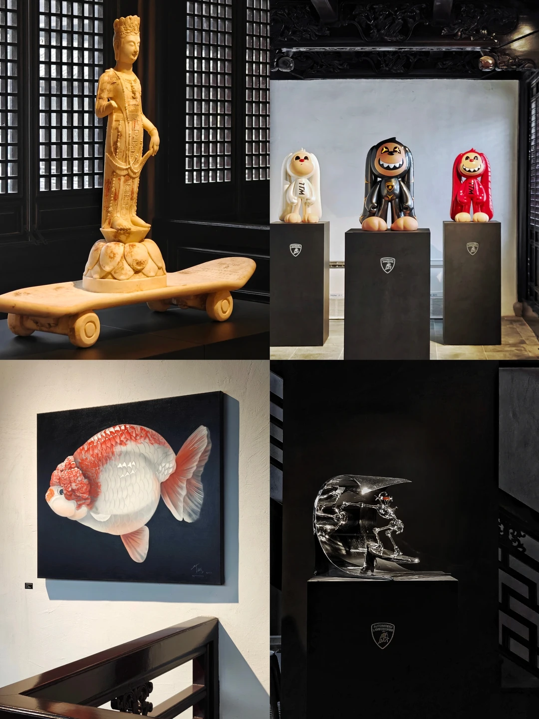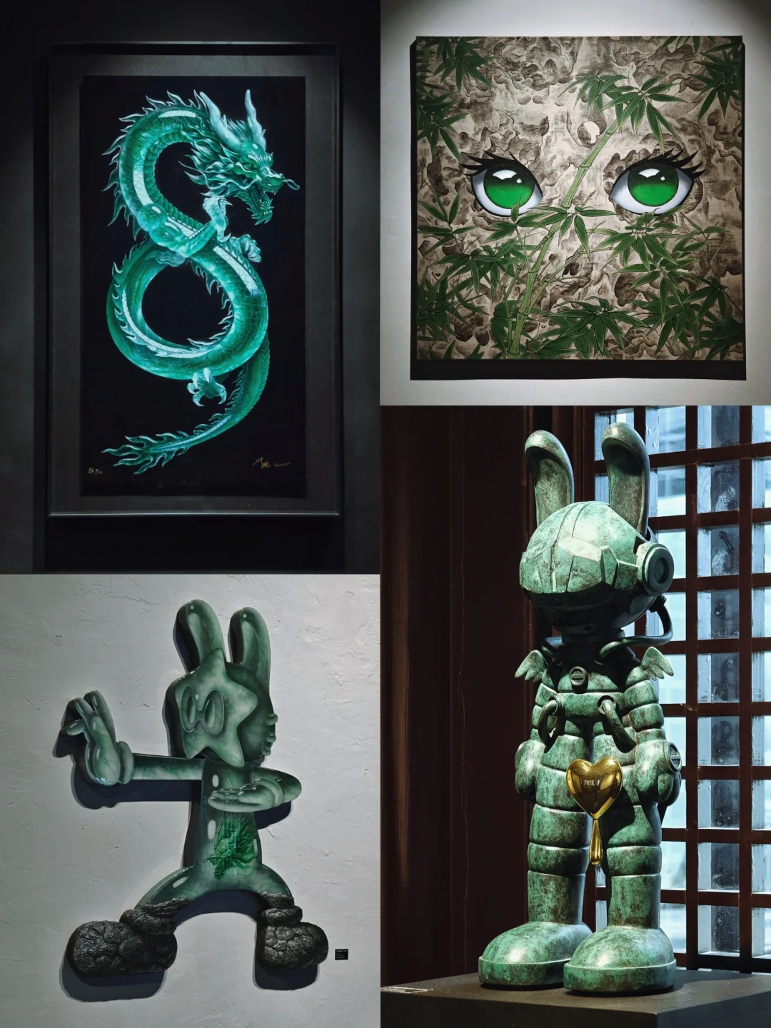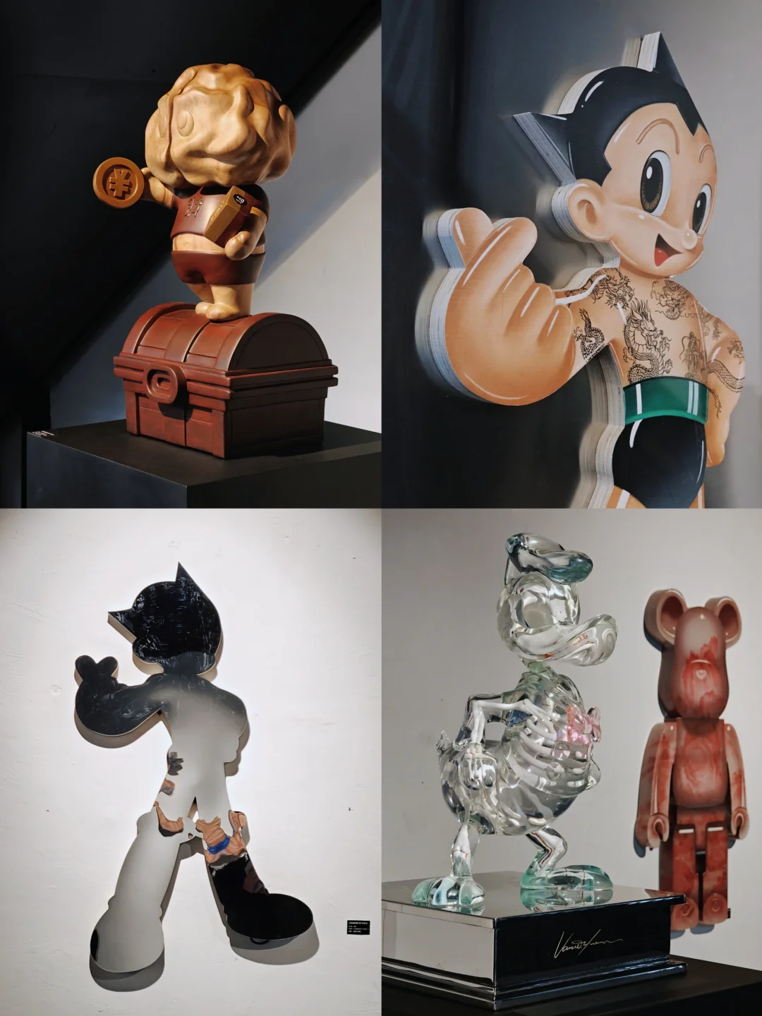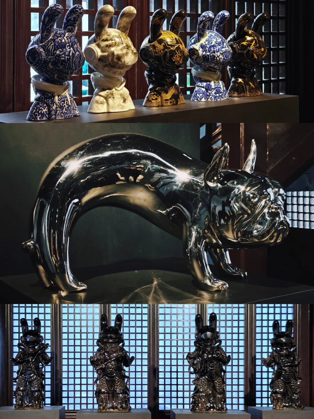 🚗展品其实分为两类,一类所谓馆藏,应该就是花钱买的,除了存疑的机械姬尺寸都不大,似乎也没什么特别珍贵的限量版(本人对潮流艺术不熟悉,懂的朋友可以来科普下),看起来都像是比较容易买到的。另一类是艺术家创作作品,其中訾鹏的作品之前在TX淮海免费展出过,草坪前那个大型的TUTUMOKEY兔极猴出自Jano.X。我觉得比较有意思的是南方的作品,他出生于邯郸,痴迷于曲阳石雕等古美术形式,他本身又是国内重要的滑板收藏家,作品都是在画板上做结合创新。