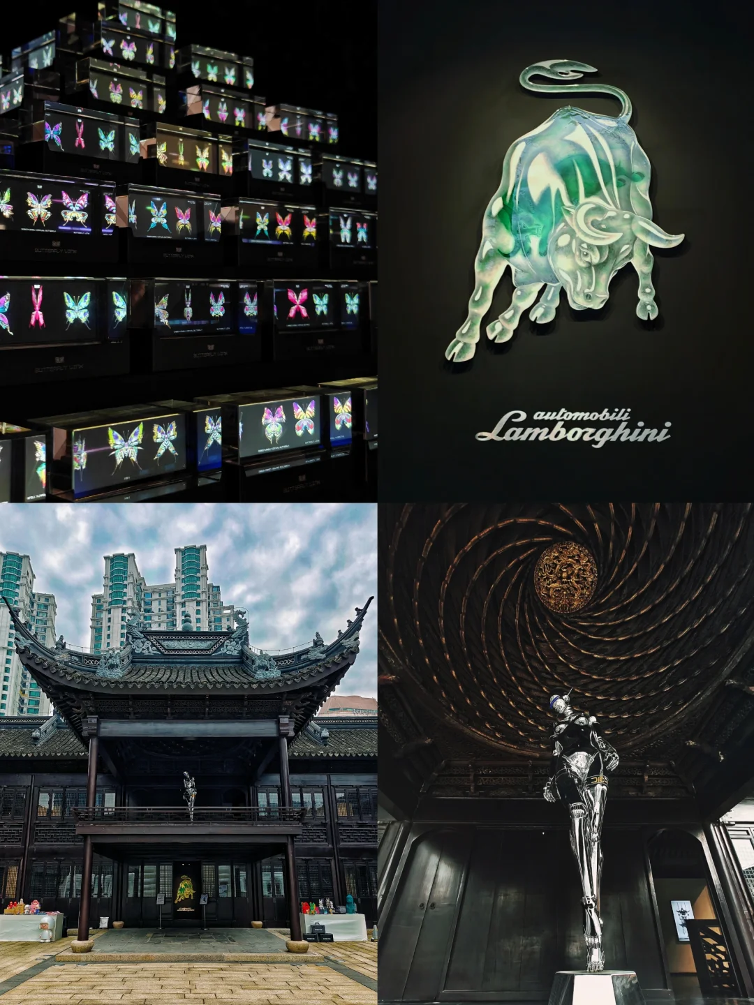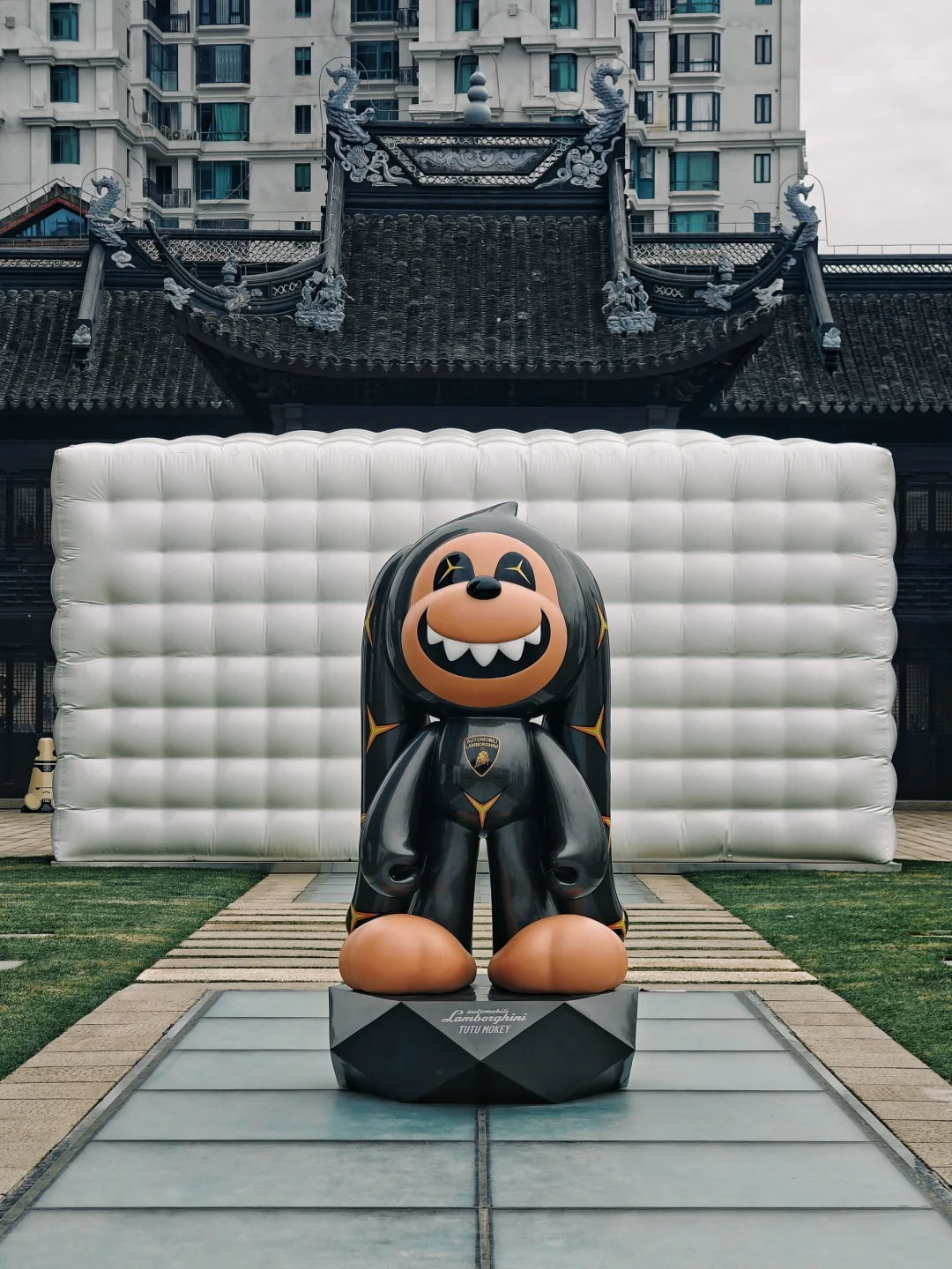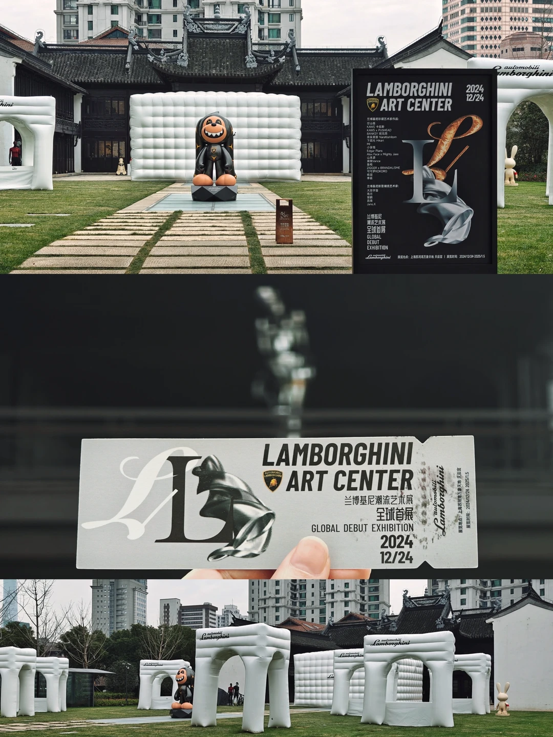 🚗草坪上的搭建用了充气材料,效果不错挺有气势,成本应该不高。走到蕞大那个充气白方块后面发现是快闪店,卖的都是兰博基尼的各种周边产品,包括服装和配饰。天后宫门口左右也有潮流商品售卖,露天的摊位,观感不好。