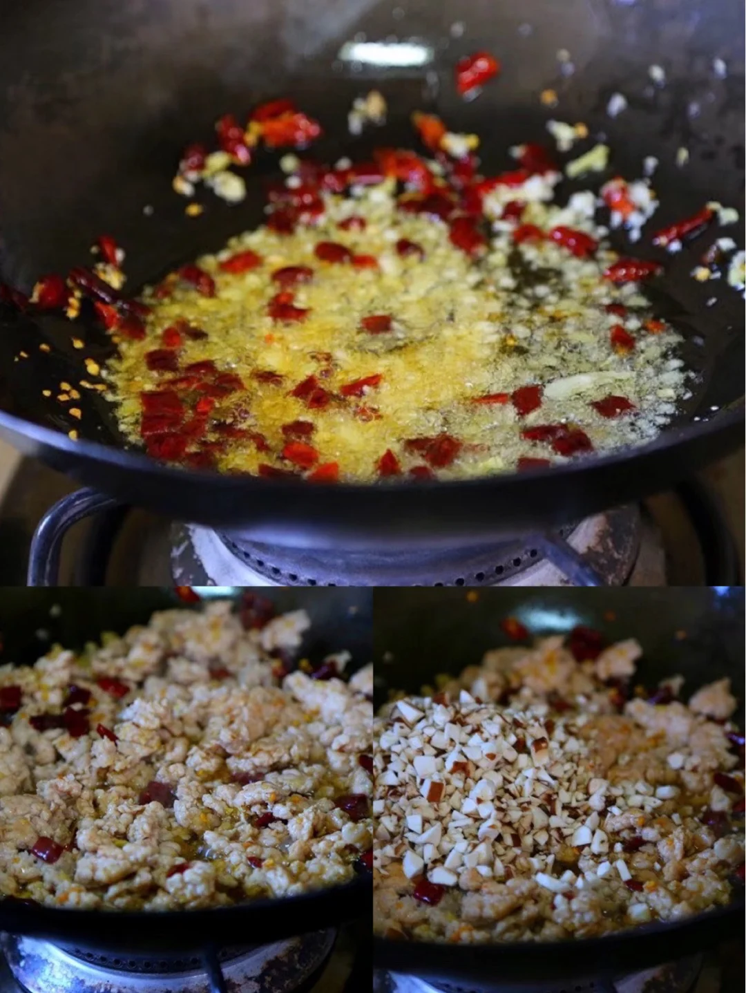 9.锅底上少许油,烧热放入生姜沫大蒜片爆香,小火哦放入干辣椒段儿