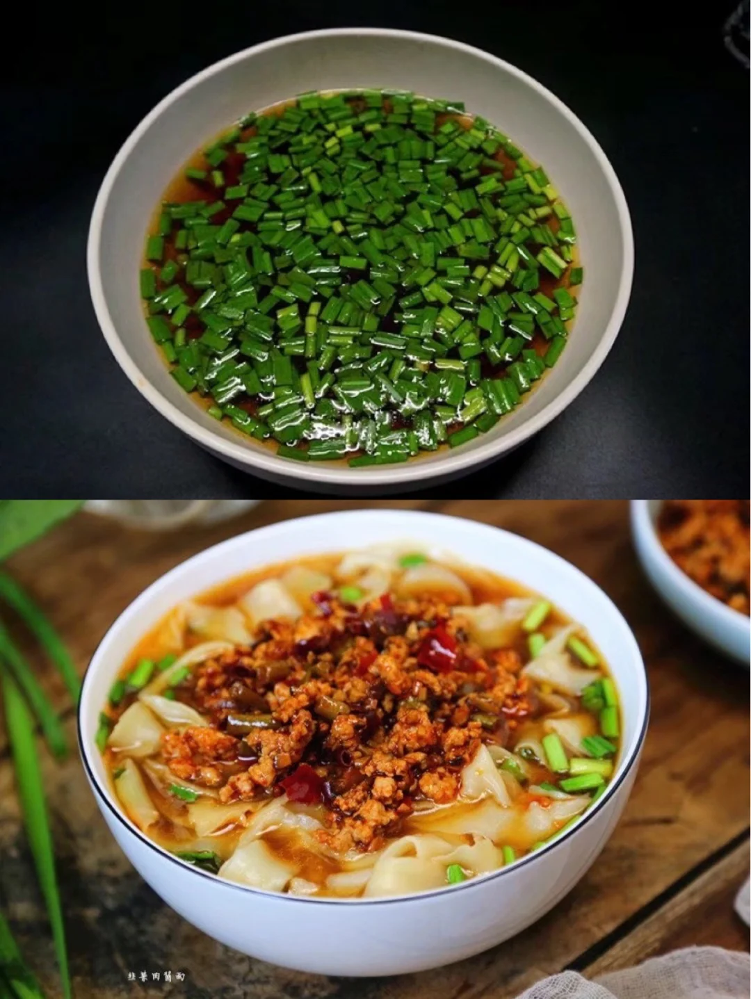 18.快煮好的时候舀入少许面汤到刚才的韭菜料汁儿碗里,至韭菜烫熟