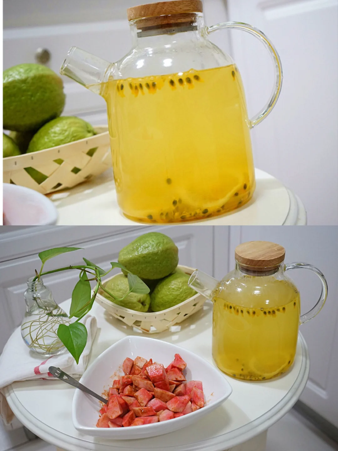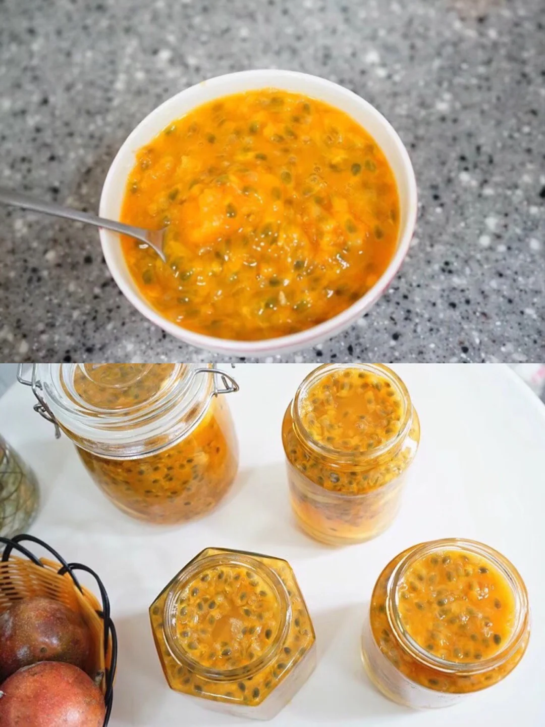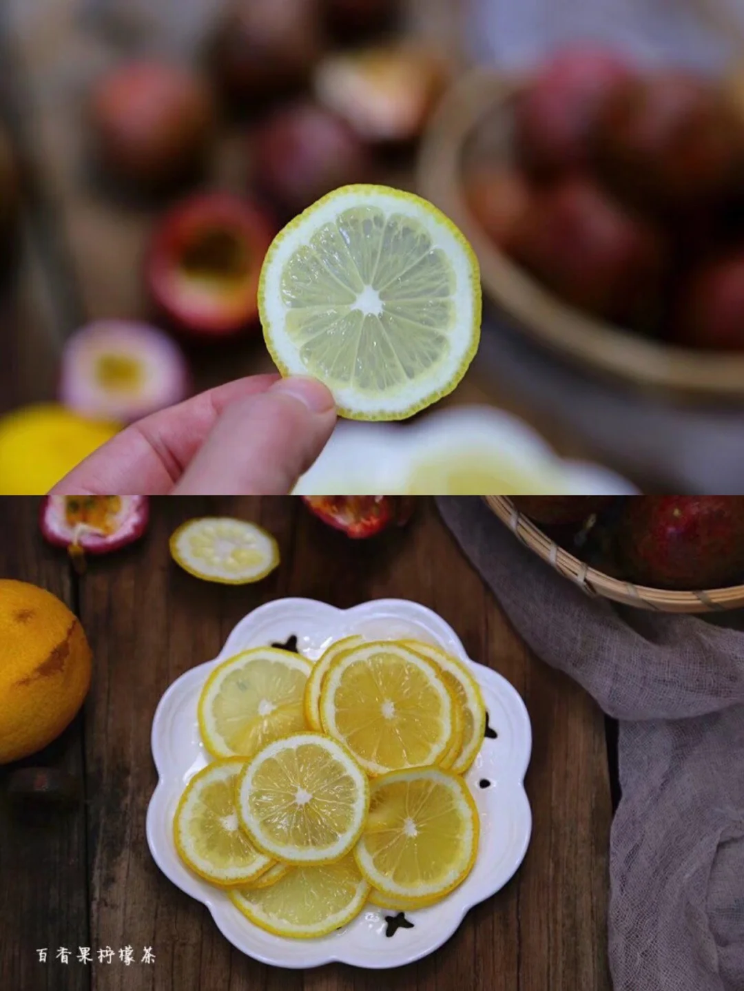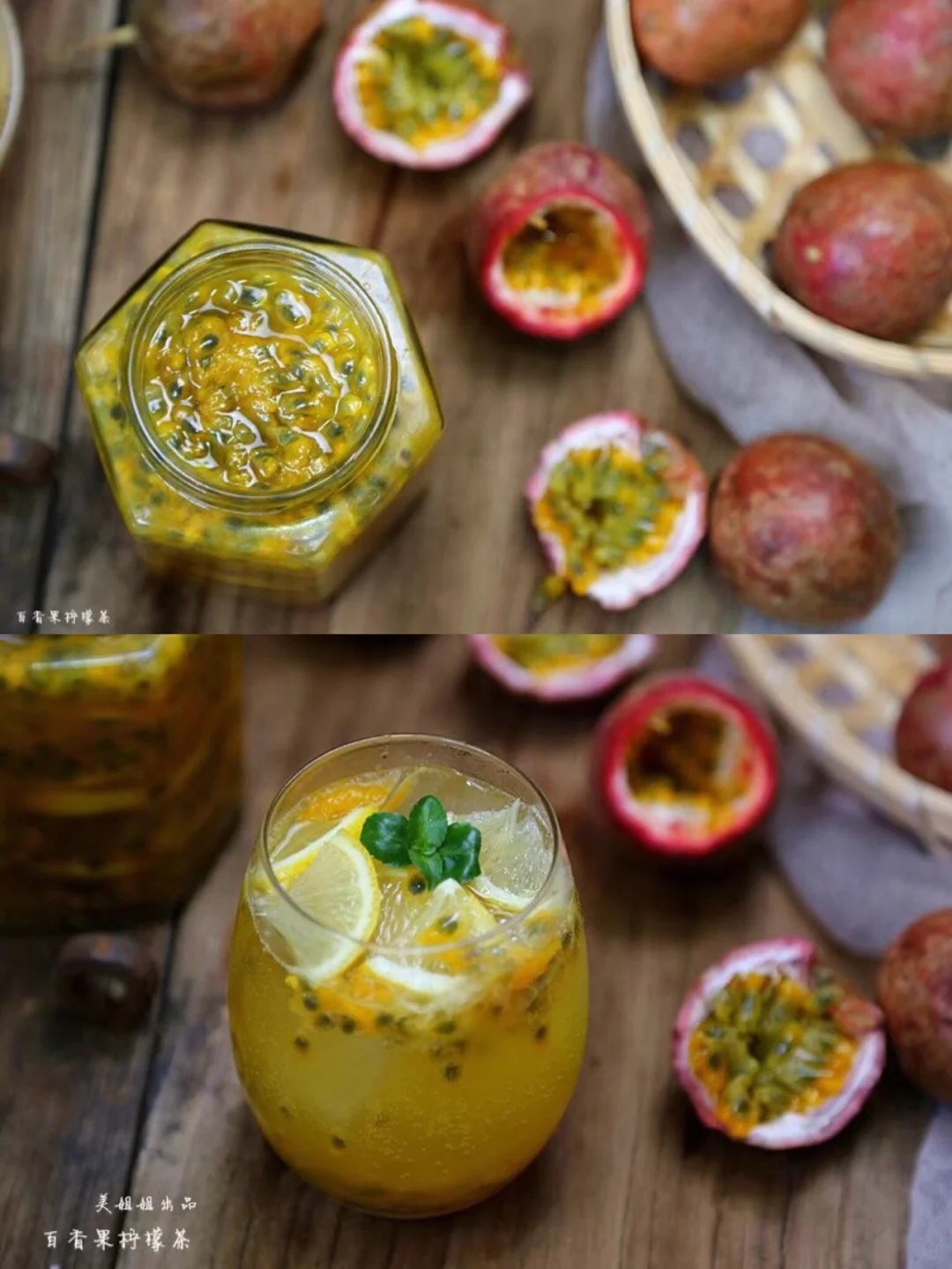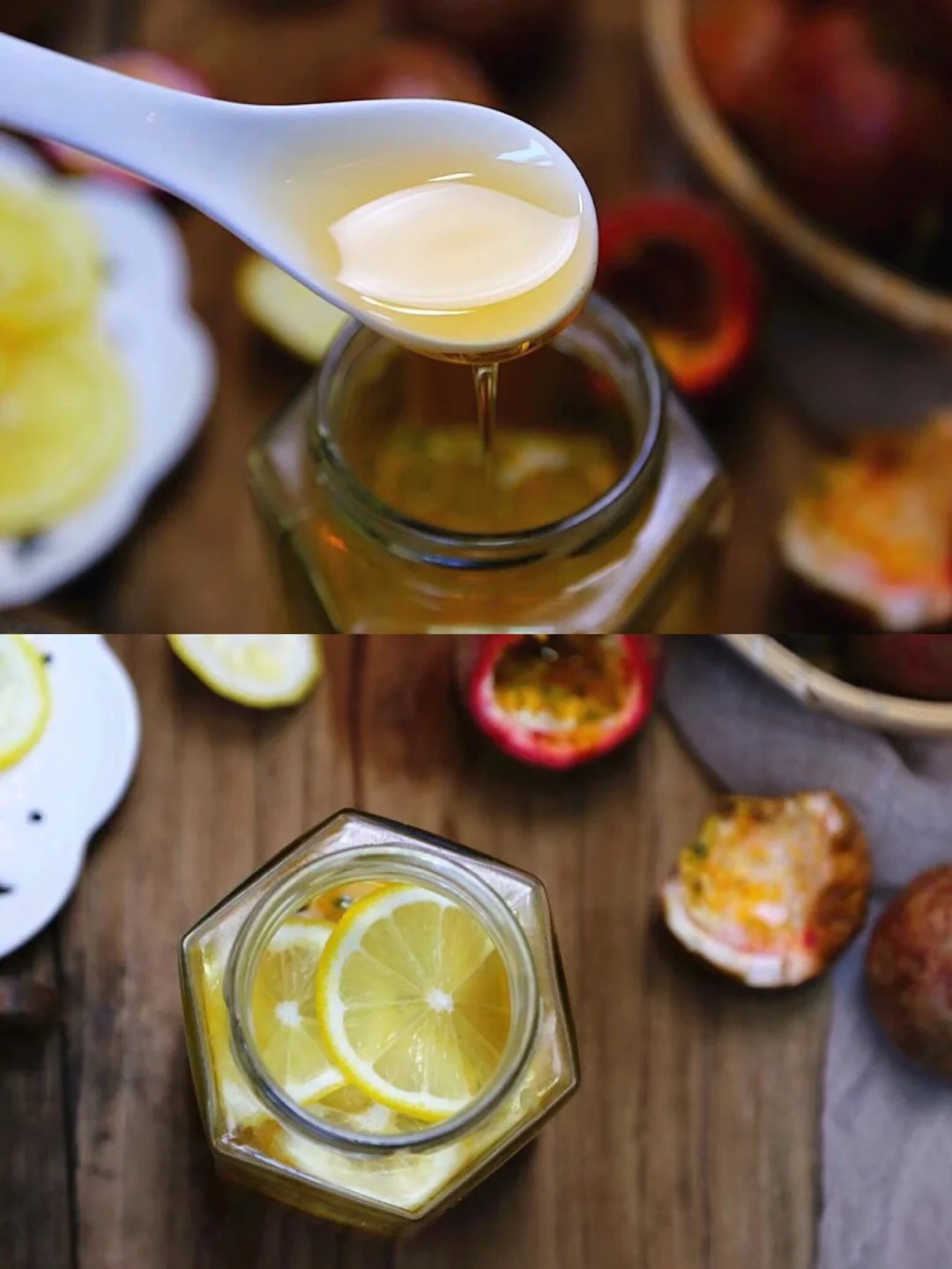 7.蜂蜜铺好之后再放刚才切好的柠檬片,多放几片 接着就是百香果,虽然买的时候给配了专门开口的 女汉子的我直接都是用手剥开,然后用干净的勺子挖出来就行
