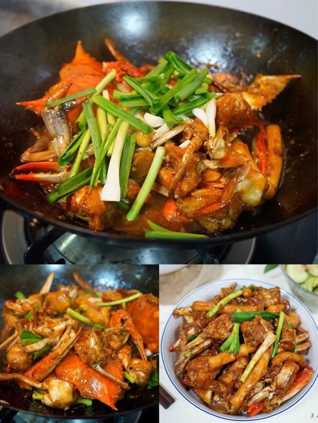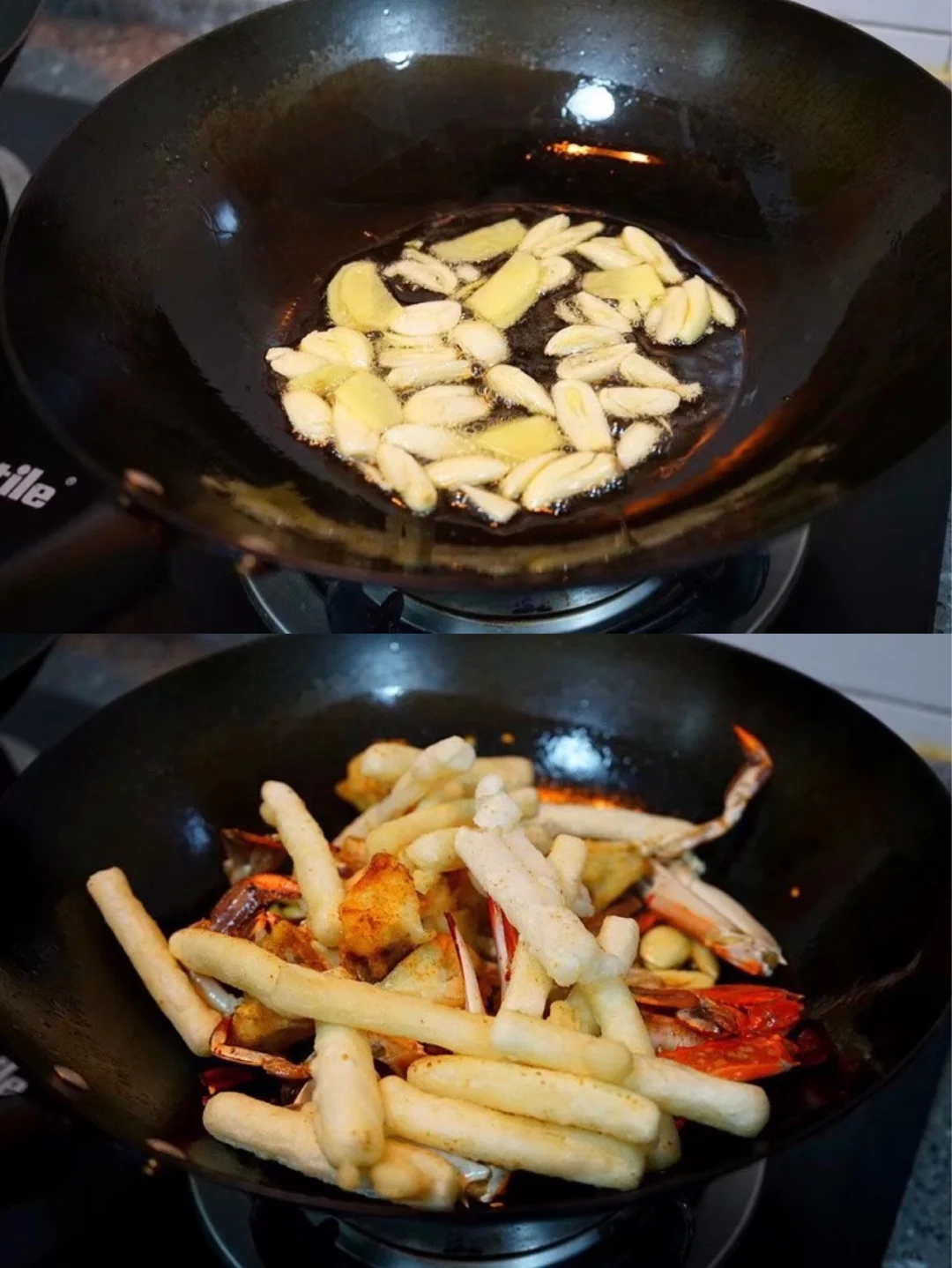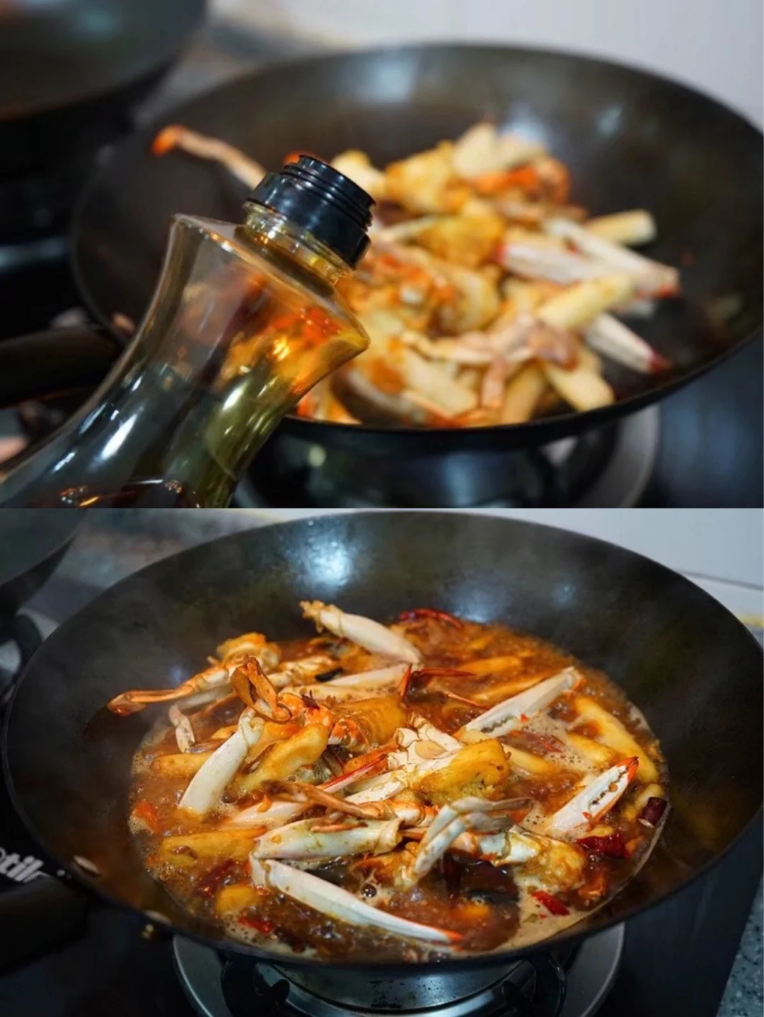 12.炸好的年糕和蟹倒入到锅里,转大火,快速翻炒13.一大勺料酒,一大勺生抽,半勺耗油,翻炒出味儿