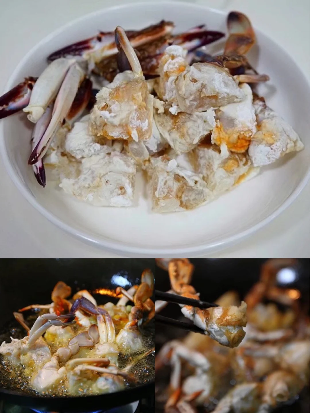 7.我们开始来给蟹过油,锅里放入稍微多一点的油,油烧热 倒入蟹块