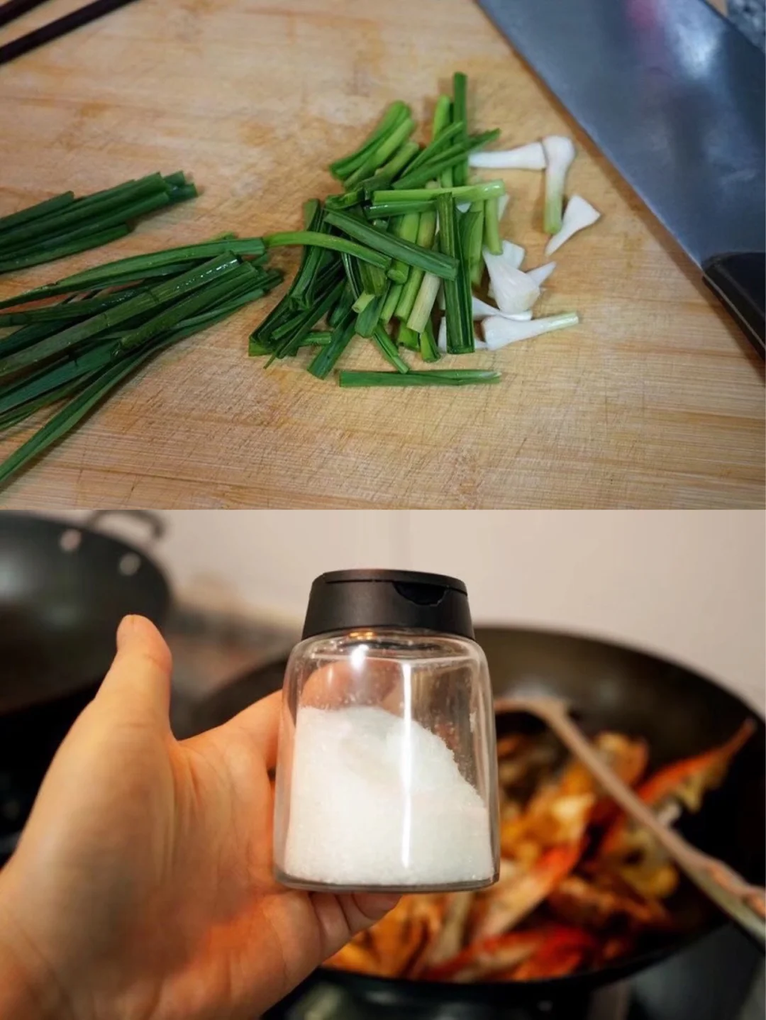 15.蒜苗段清洗干净,切长段,没有的话葱苗也可以啊