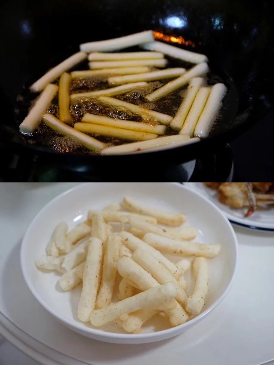 9.炸螃蟹的油继续炸年糕 友情提醒,年糕扎过了就是空心了的时候就会爆炸哦 我就是受害者,就去外面拿个个东西回来结果就听见噼里啪啦的 我想着去关火结果身上炸的全是油,手臂好多烫痕, 稍微炸至即可