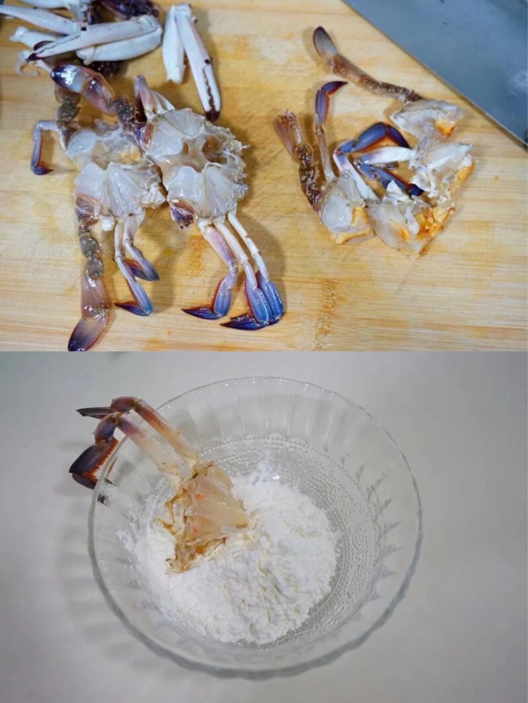 5.每个蟹肉上均匀的裹上淀粉,然后抖一下,多余的粉去掉6.一一弄好
