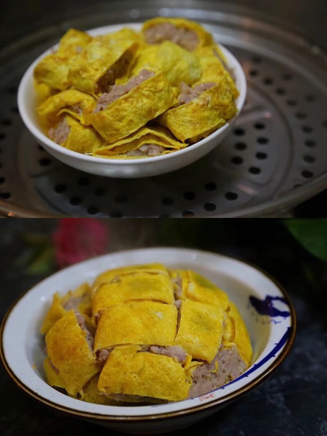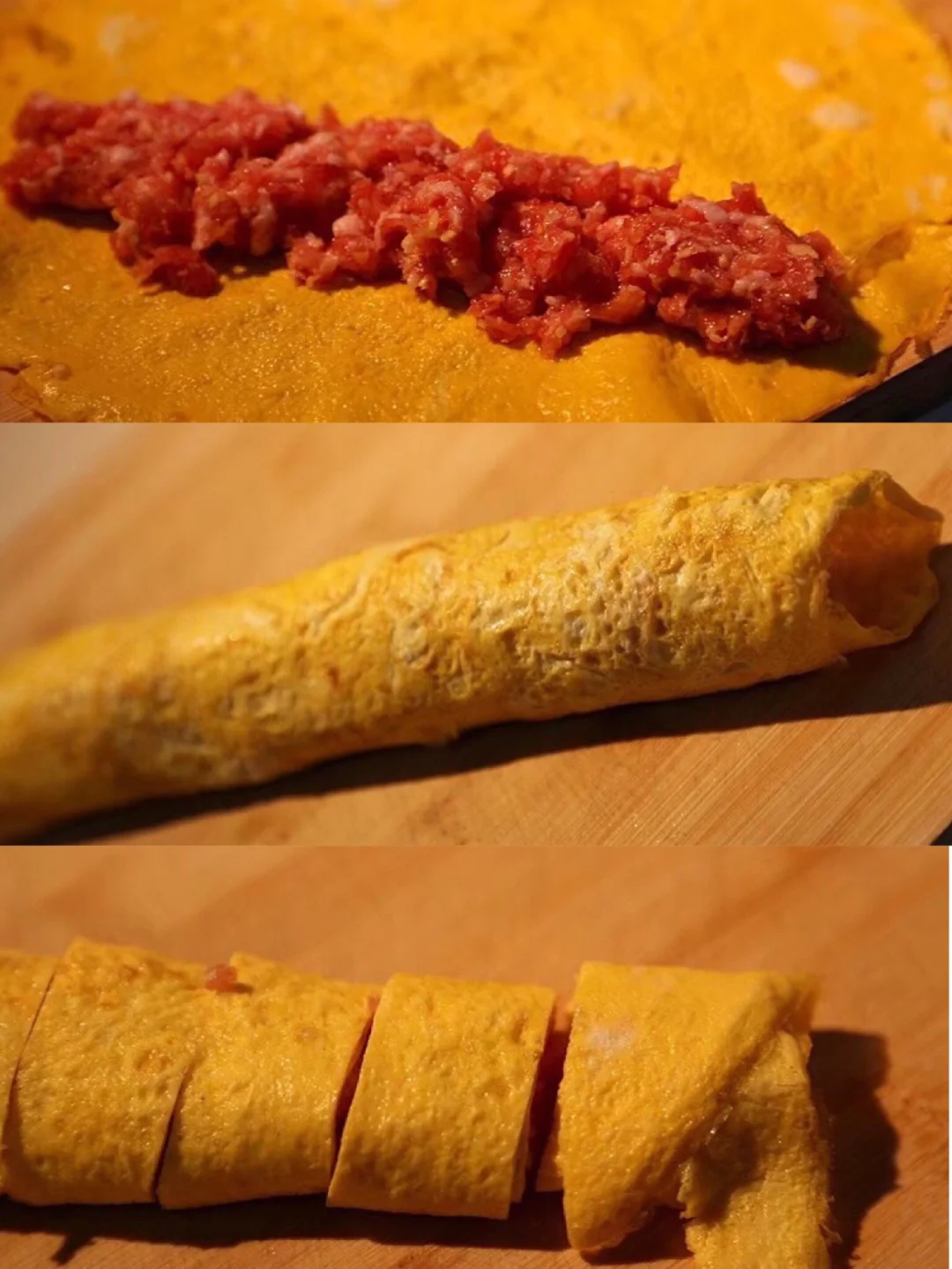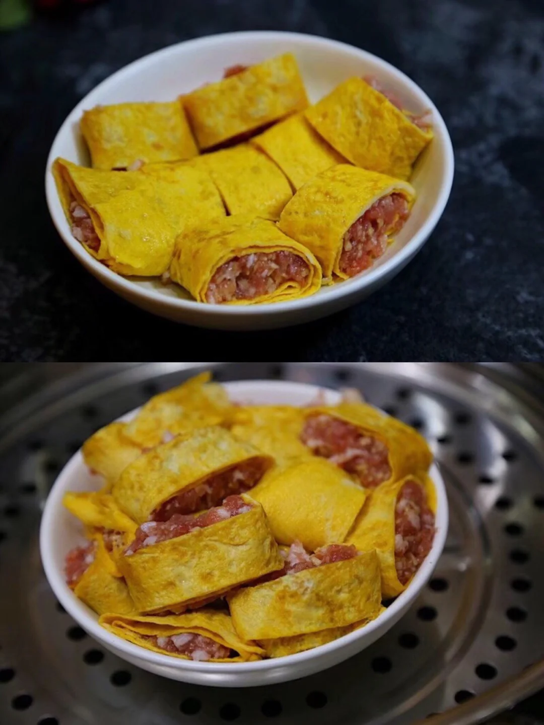 12.然后从铺肉的那一边卷起来,尽量卷的紧一些哈,【很多亲可能会觉得卷的时候不太粘,蒸的时候就自然粘啦】