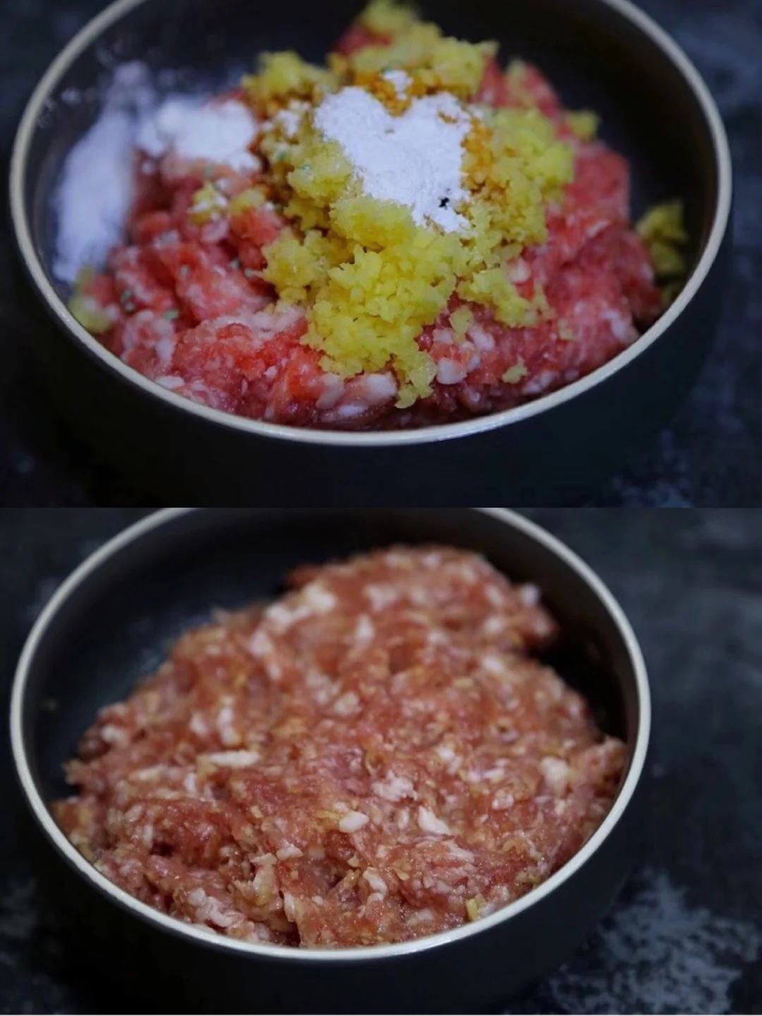 3.剁一点要超级碎碎的生姜末放进肉里