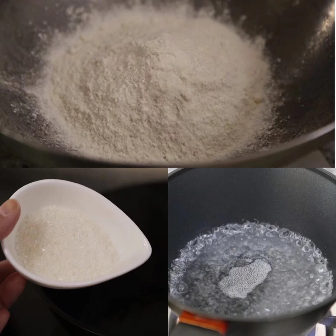 2.煮锅里倒入和面的水,加入准备好的白糖