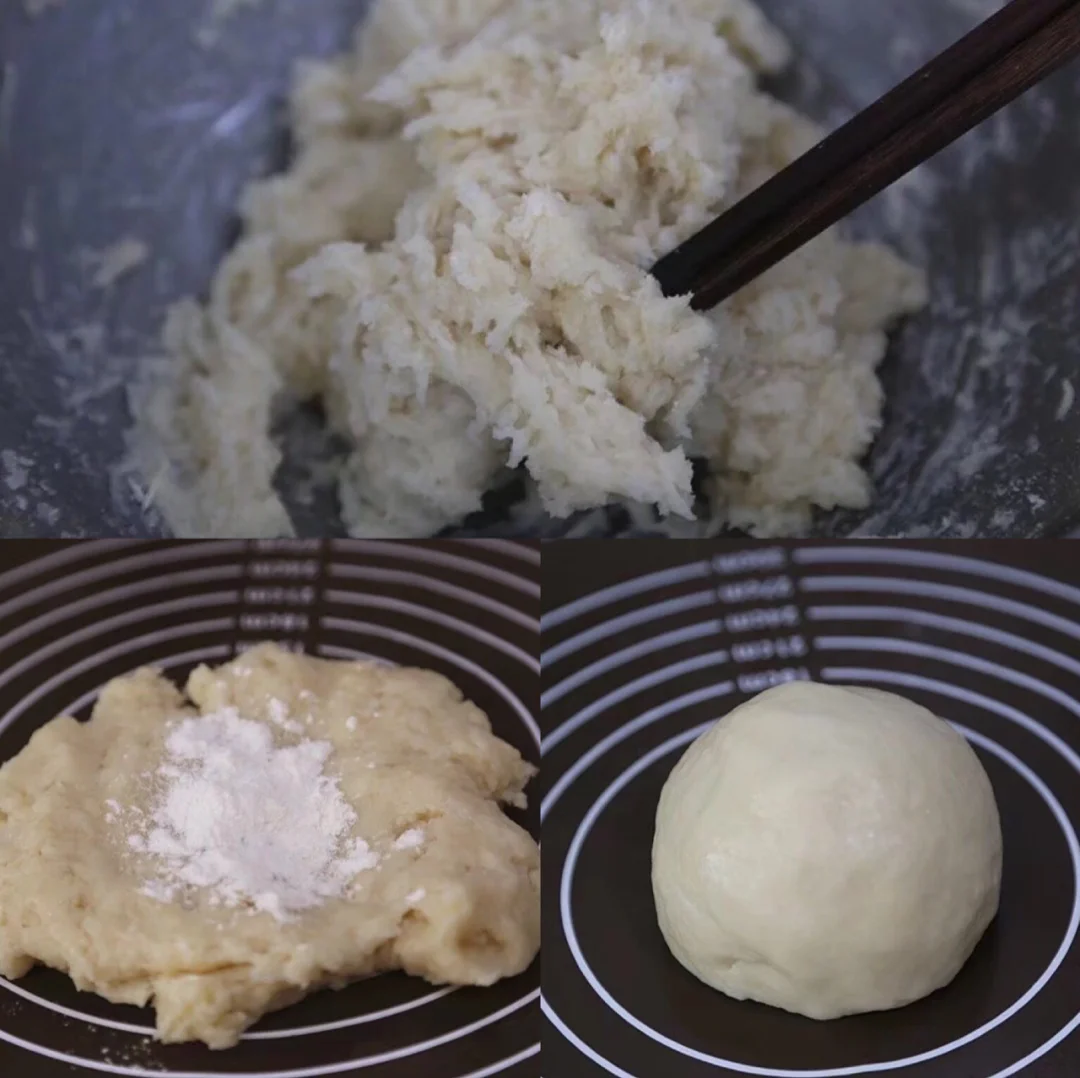 4.将煮沸的水慢慢的倒入面粉里,快速搅拌至完全没有干粉的状态[每家面粉的吸水性不一样,自己调整,但是面团越软炸出来的糖糕越好吃哦] 因为太湿比较难操作,所以得双手涂油才行