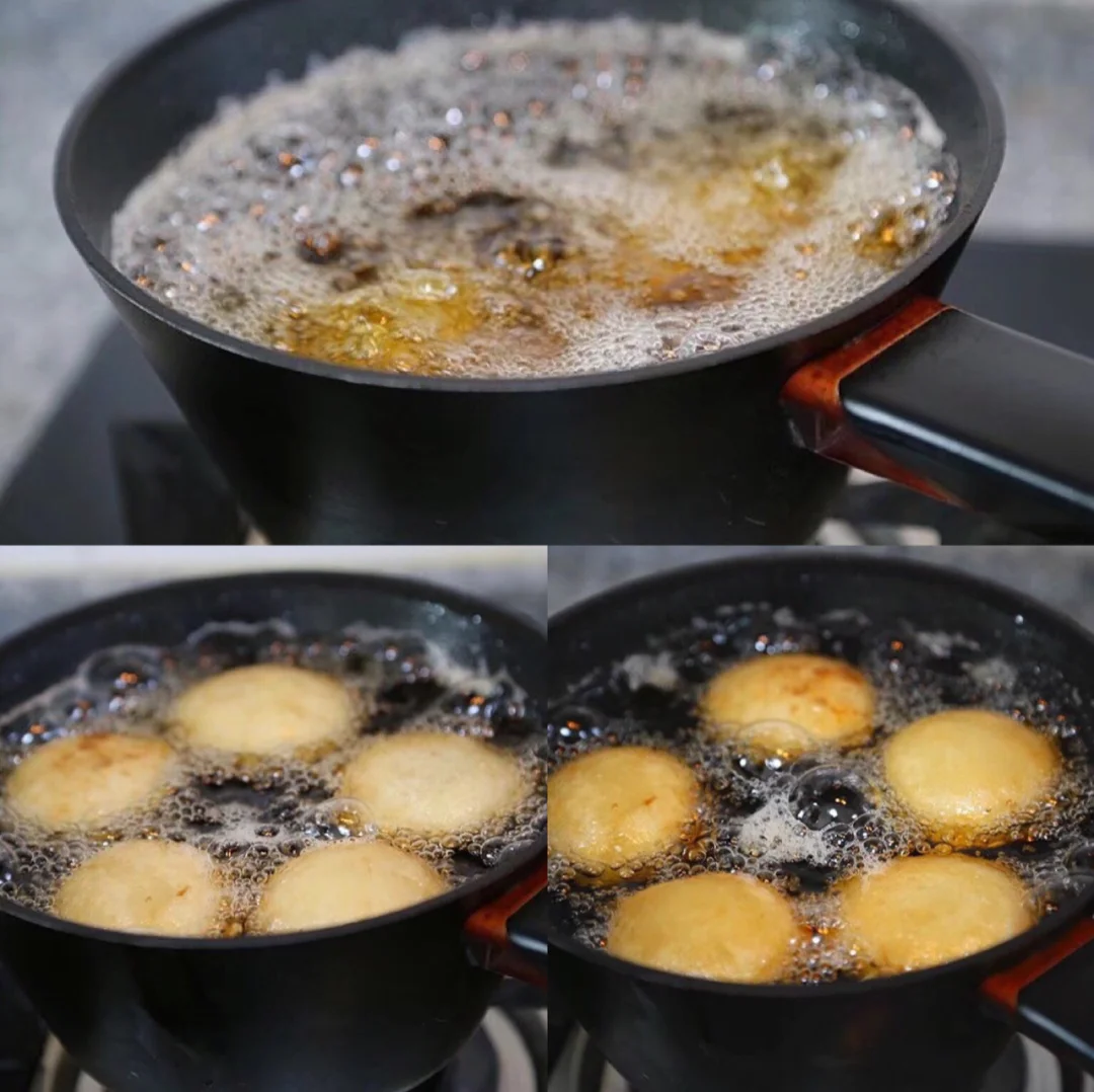 15.油温大概五六成热的时候加入炸锅里,锅铲上抹油一个个慢慢的放进去 [小锅省油,一次炸四到五个,多了会黏在一起]