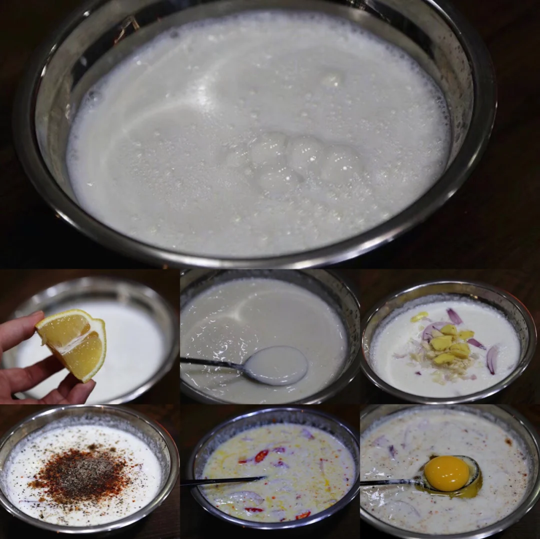 我是先去掉籽,直接用手挤的, 静置五分钟左右,白脱牛奶形成,加入半个洋葱的圈圈,少许大蒜沫,几片生姜块,盐适量,黑胡椒碎5g,少许辣椒粉,麻椒粉啥的,根据自己喜好来吧 再放入两个鸡蛋,搅匀.,上面的材料可以根据自己喜好来换的哈
