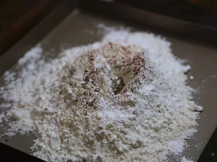 现在我们来制作面壳:面粉300g,淀粉80g[土豆淀粉,玉米淀粉都可以],辣椒粉一大勺,黑胡椒沫一小勺,五香粉一小勺,盐适量,最重要的泡打粉一勺,其他的自己看着来
