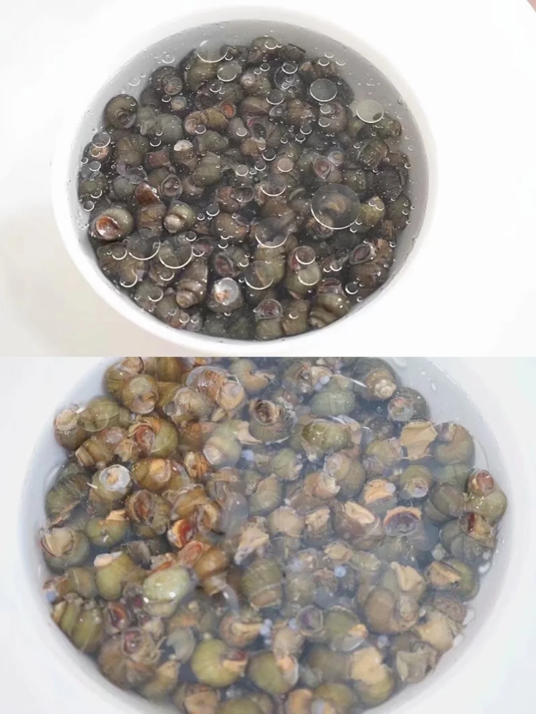 1.螺狮买回来之后最好一早去买,然后放入一个大一点的碗里倒入超过螺狮的水 倒入一丢丢油,拌匀 2.这个下午的状态,你们看一下吐出来很多小螺實和脏的东西 然后找一个大一点的漏筛子,用手搓 直到干净为止
