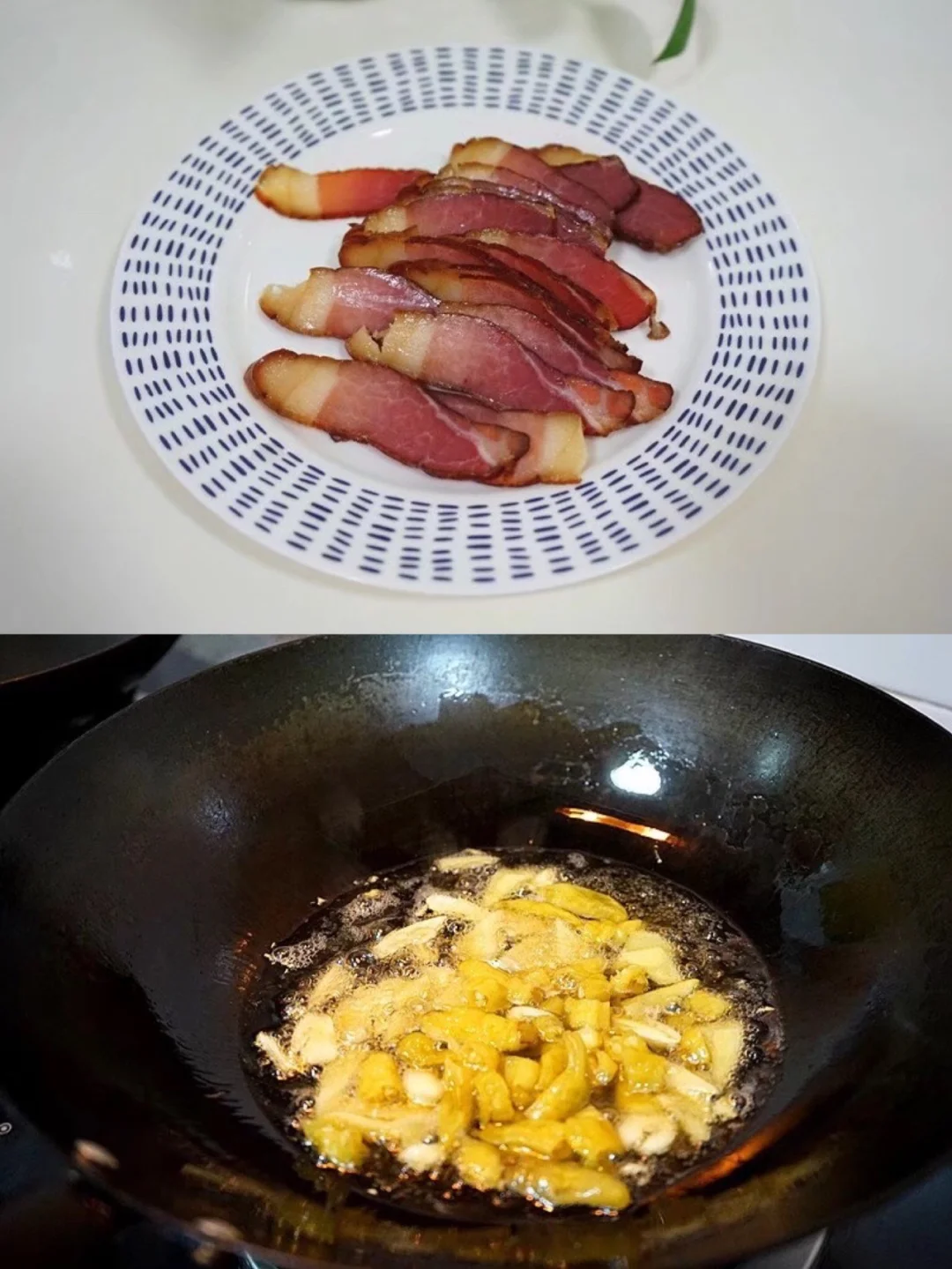 3.腊肉清洗干净,水里煮一下,切成薄薄的小片待用