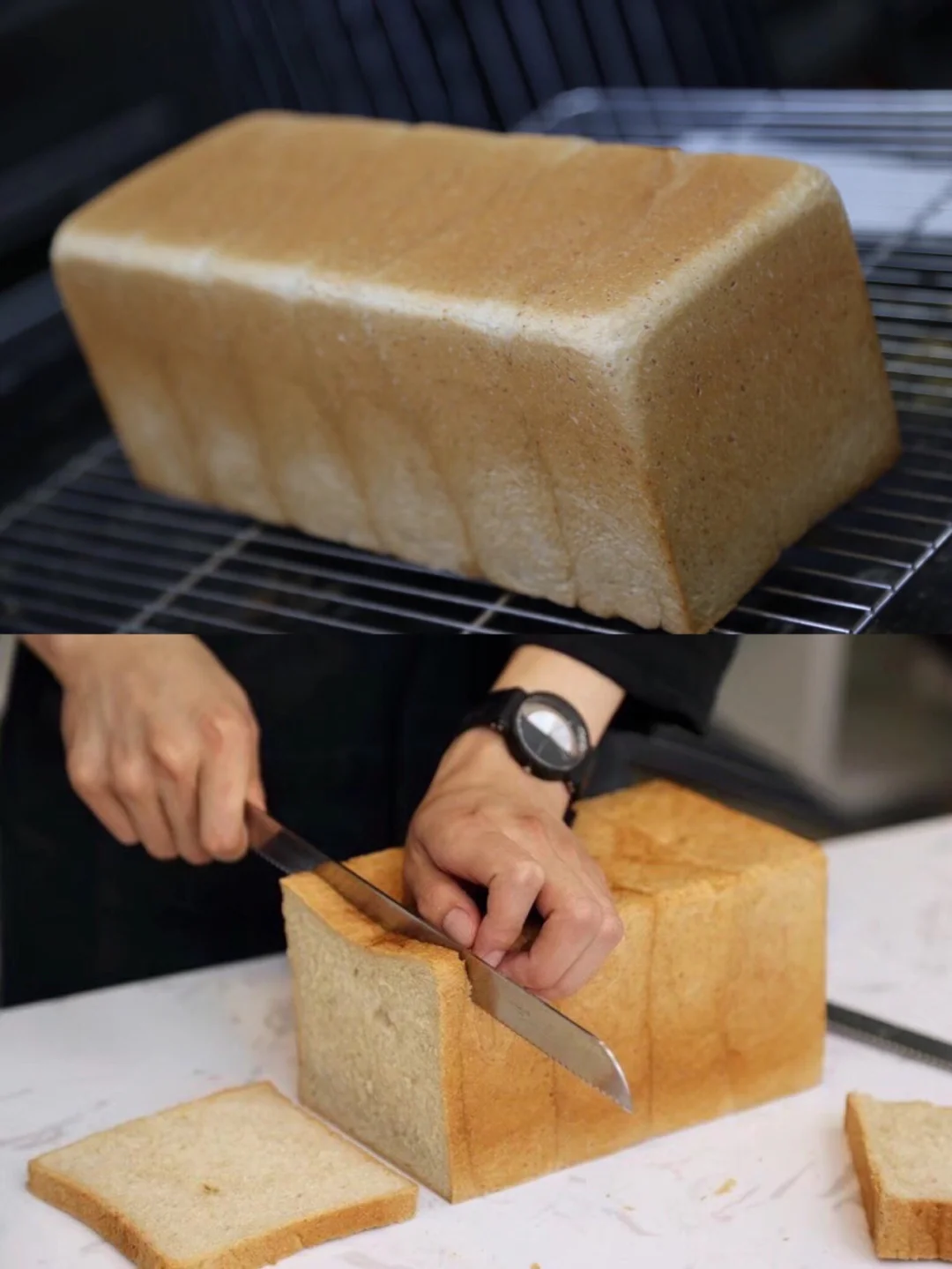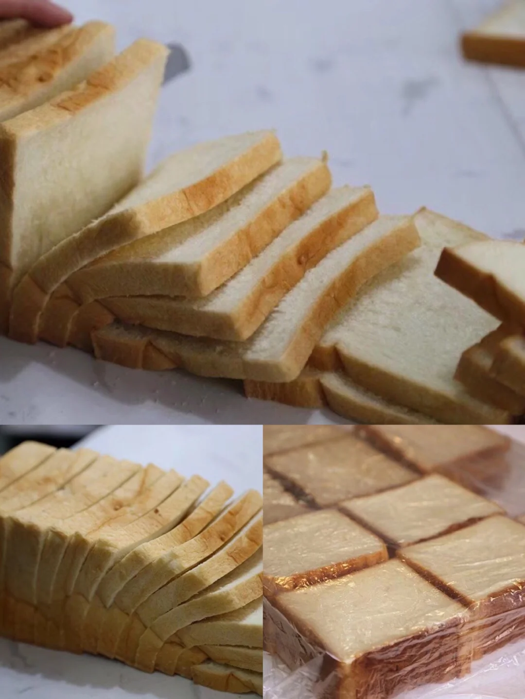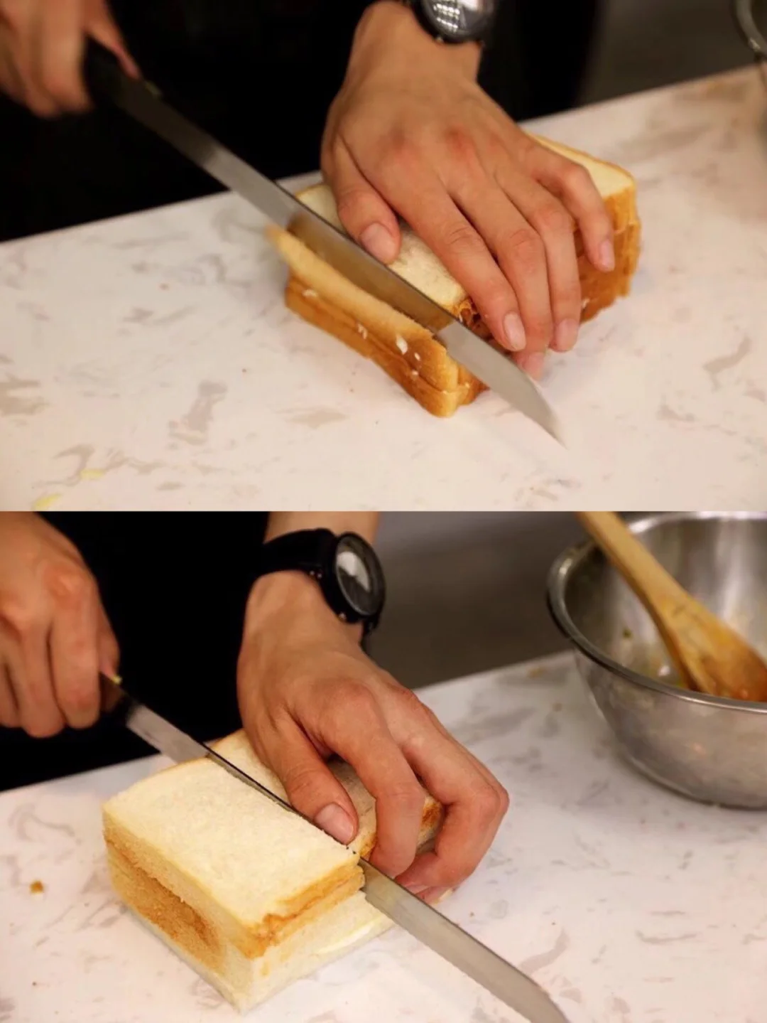 3.如果刀工不好的人可以把吐司横过来切会容易多了