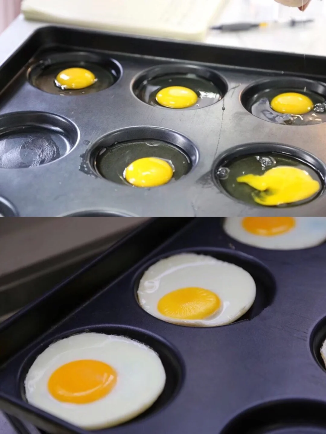 6.鸡蛋打入到烤盘里,烤箱200度预热