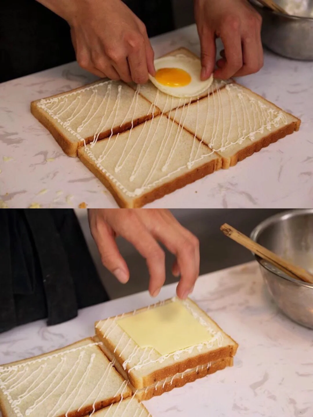8.吐司片摆好,挤上沙拉酱,鸡蛋摆上去