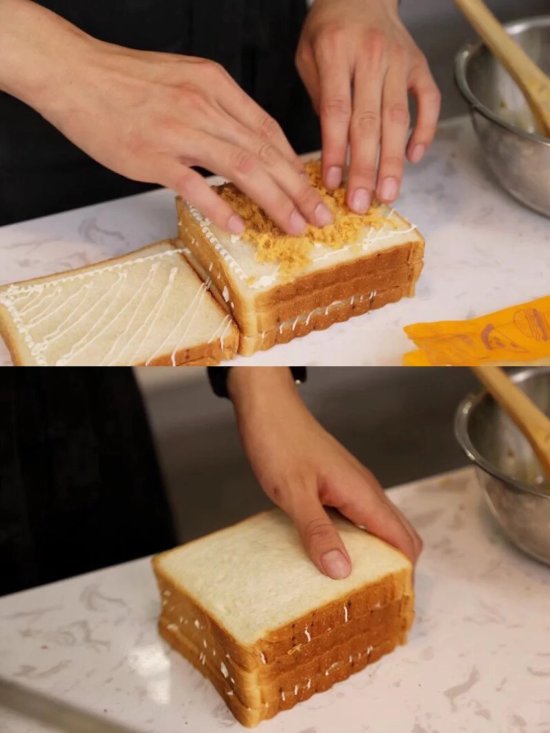 10.盖上一片吐司,然后摆上多多的肉松