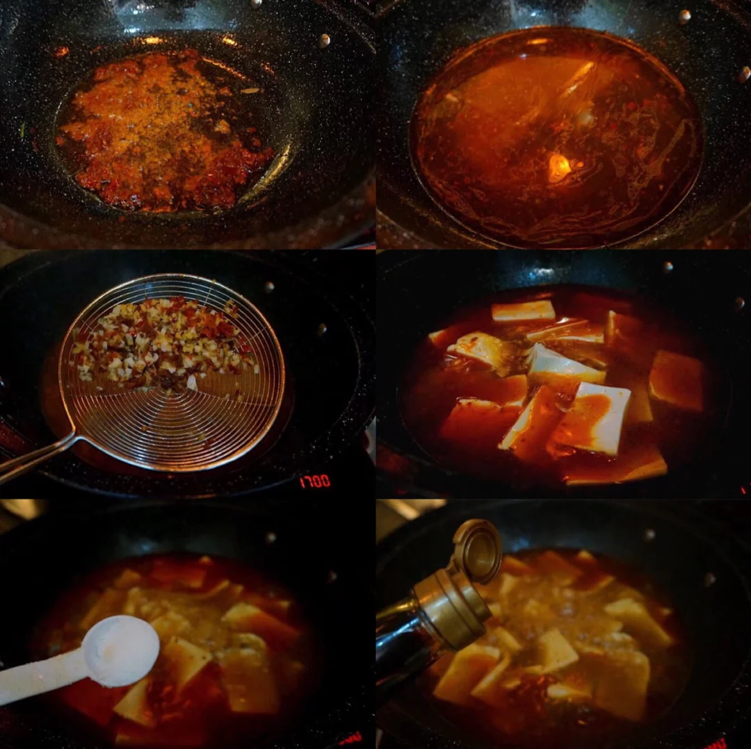 还有人问我淀粉是不是面粉我就醉了,你们可以百度下 豆腐煮好之后放入适量水淀粉勾芡, 豆腐连汤倒入刚刚盛有菜的碗里,在撒点花椒粉,辣椒粉之前炸香的辣椒花椒碎,锅里上少许油,烧到冒烟为止 油淋到豆腐和香料上面即可,,刺啦一声太香啦。。。。不需要太多的油哈