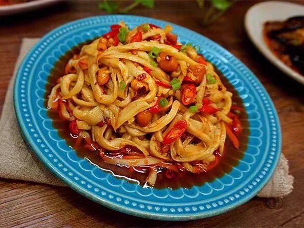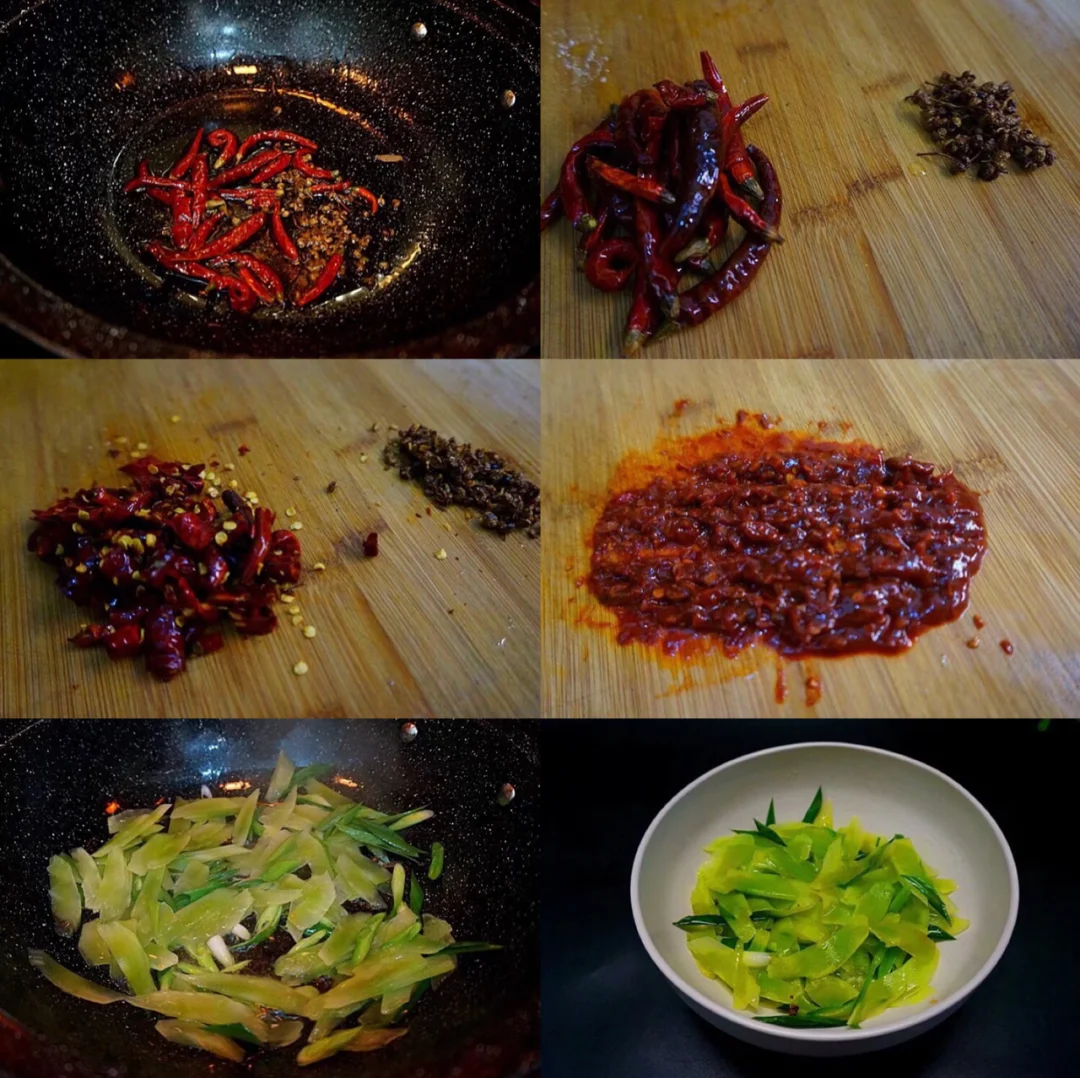 洗锅上油,小火放入少许油,四成热时候放入干辣椒和花椒炒香到微黄,捞出来之后切成小沫,辣椒不用太小,花椒稍微撵的碎一点, 豆瓣酱一勺切小碎待用