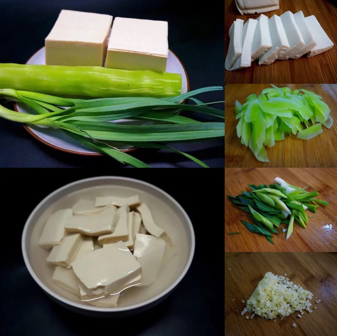 莴笋可以换成其他的,豆腐切成大小均等的块儿,不建议切得太大太厚,一是不容易入味儿,装盘也不好看,加入少许盐,用开水浸泡豆腐10分钟左右