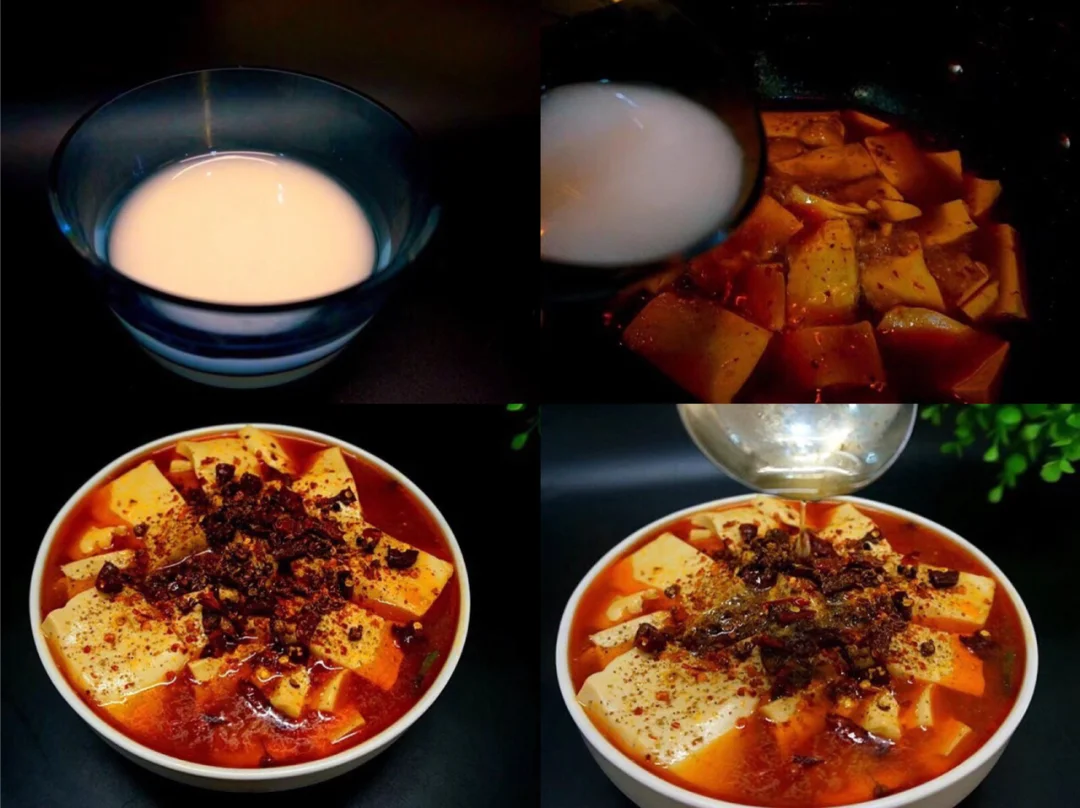 接着呢倒入豆腐,中小火煮约十分钟左右 中间放入少许盐,小心咸哦,少许生抽,鸡粉,水淀粉调制:就是少许水和淀粉混合,这里淀粉不用太多,薄芡即可