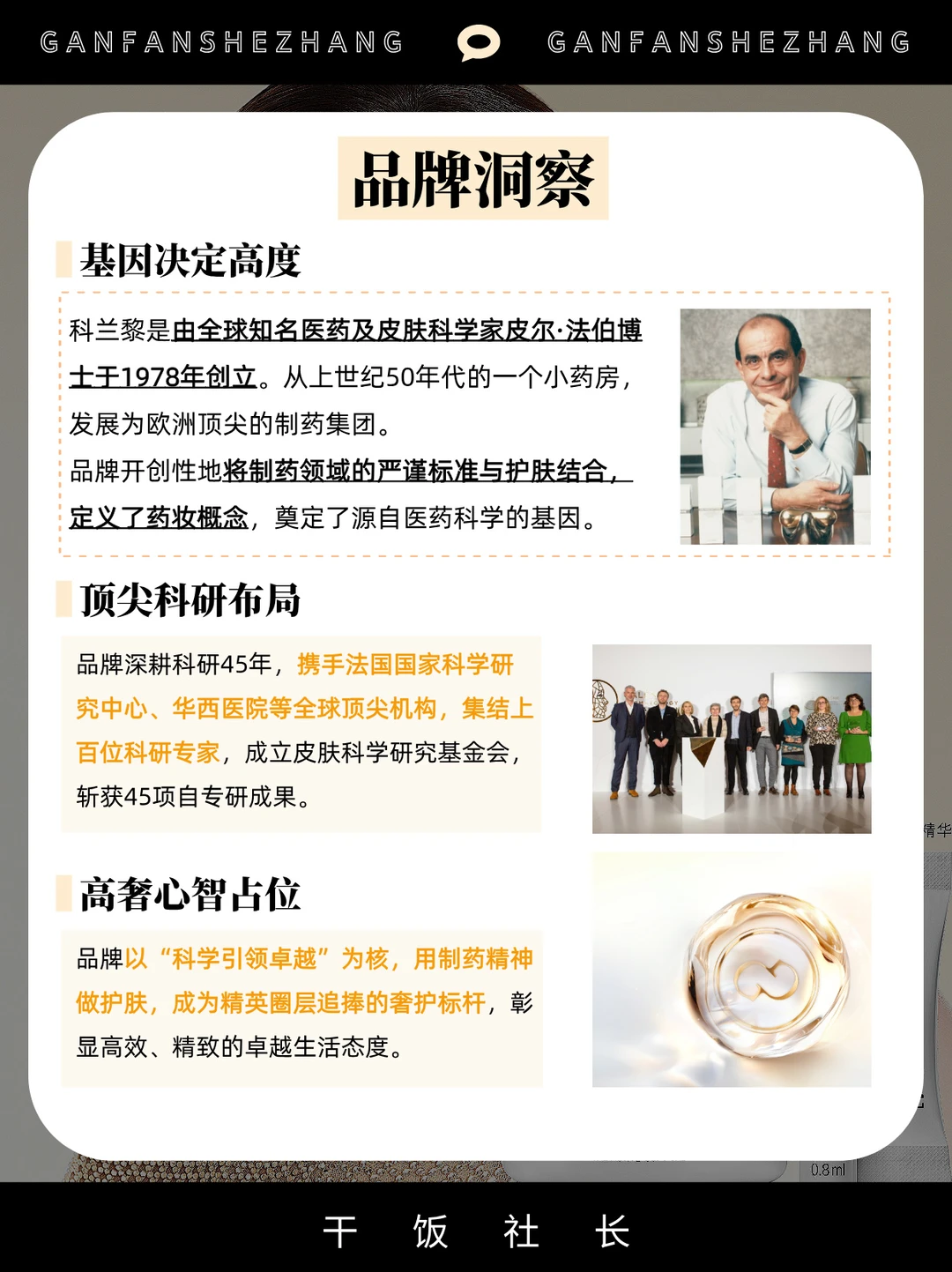 细究发现,这个火遍圈层的品牌来头不小:创始人是全球知名医药及皮肤科学家皮尔・法伯博士,上世纪50年代创办的药房发展为欧洲顶尖制药集团,1978年他开创性将医药精准理念与护肤结合,创立了科兰黎,也因此定义药妆概念。正是这份源自医药科学的基因,对于护肤科学的前瞻性,让科兰黎在高端红海成功破圈。