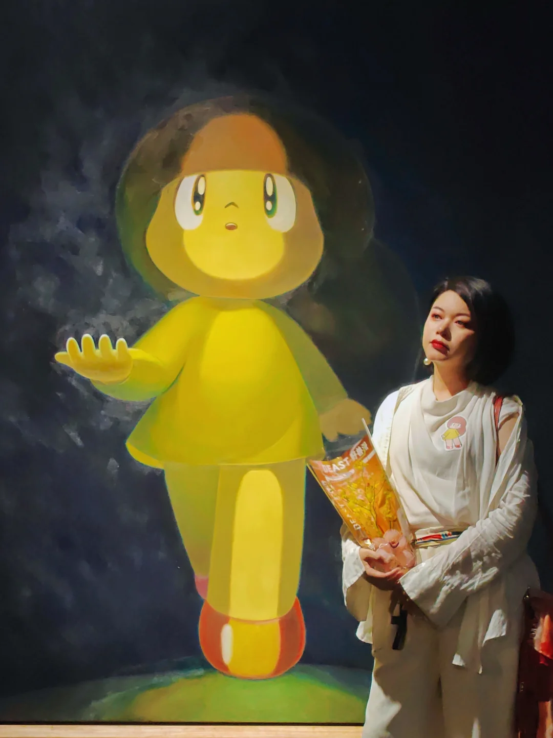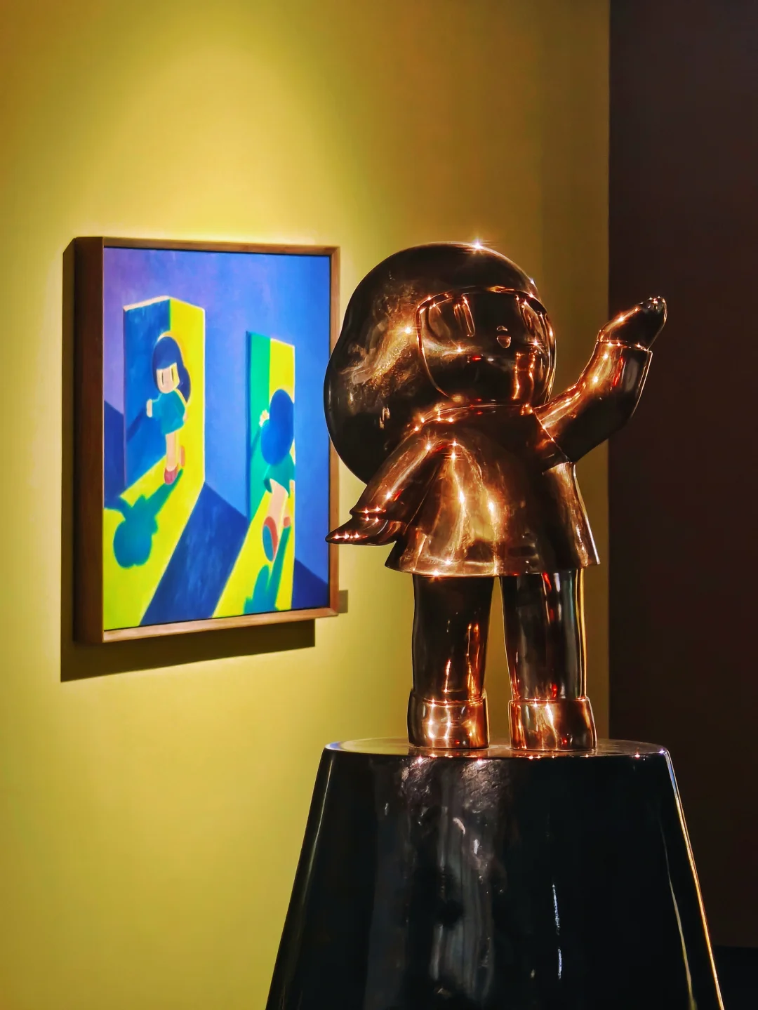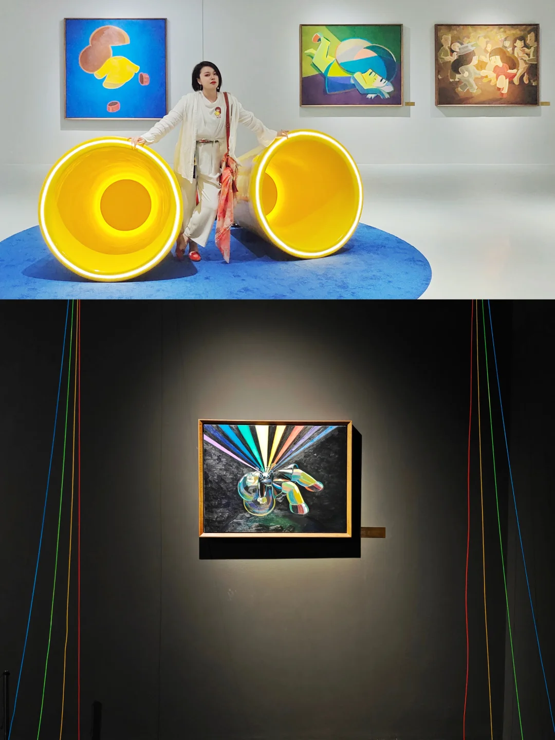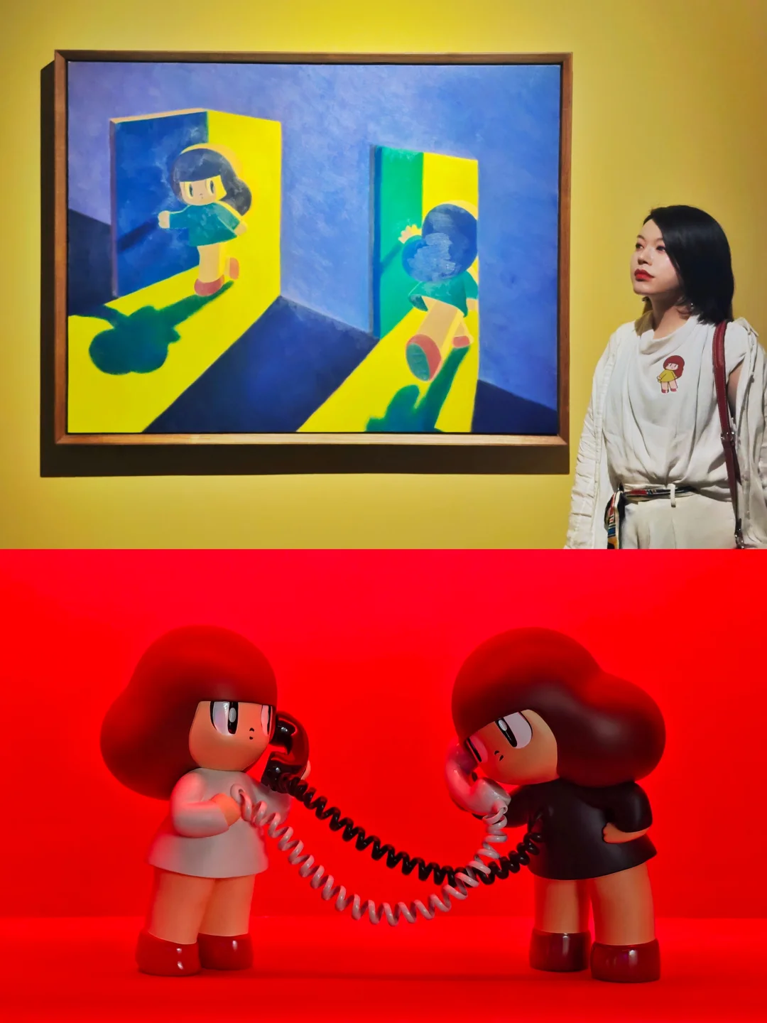 ☎️入口处有一只巨大的黄色听筒点题,两侧是6个缩小版打电话的芒姆安雕塑被放在不同颜色灯光的壁龛中,引领观众走入🥭妹妹的世界。
