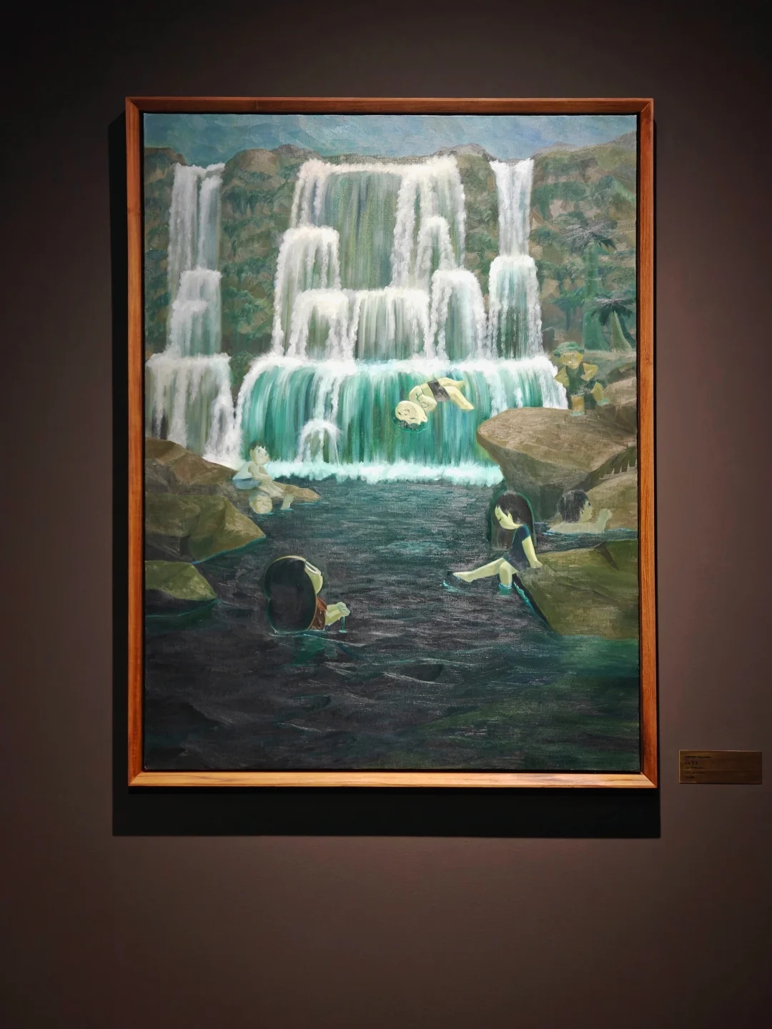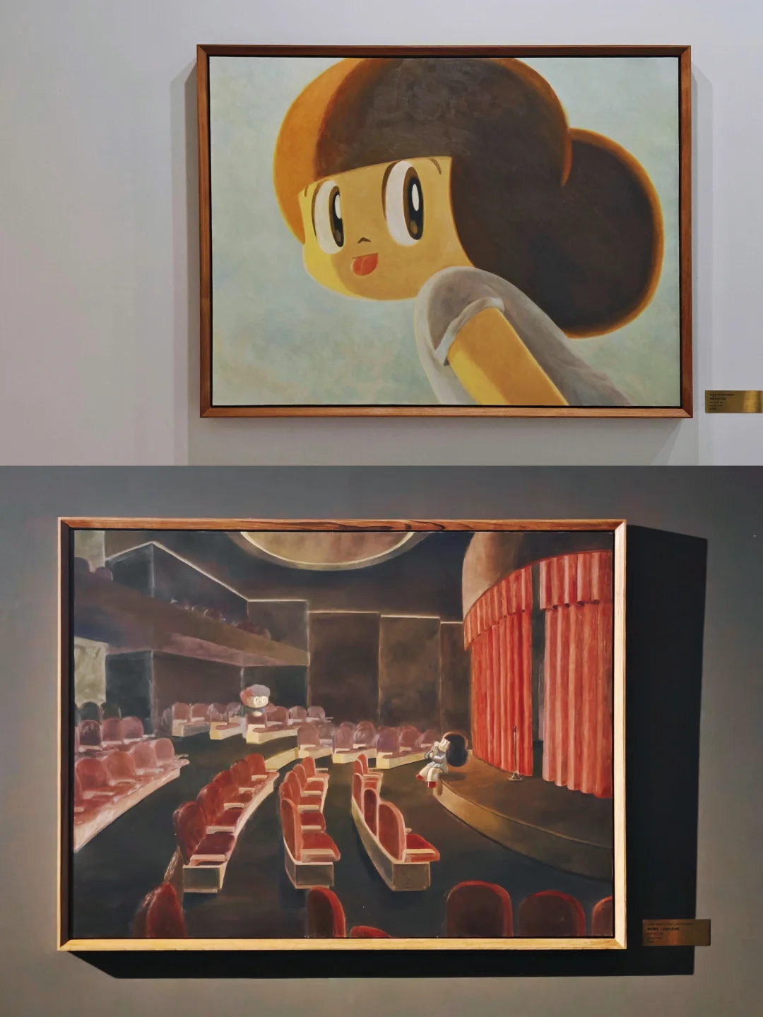 🖼️第一个展厅整体是黑色调的,剧场打光增添了神秘感。迎面就是巨幅的主推作品《A STEP TO THE LIGHT》,画中芒果妹前腿踏入光明,后腿仍在黑暗,像极了当代人挣扎前进的状态。