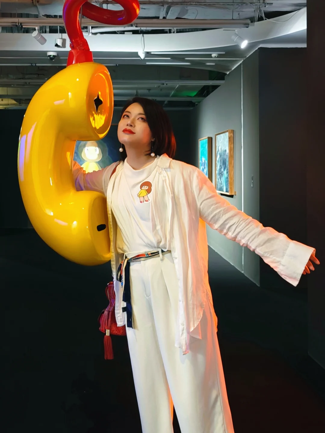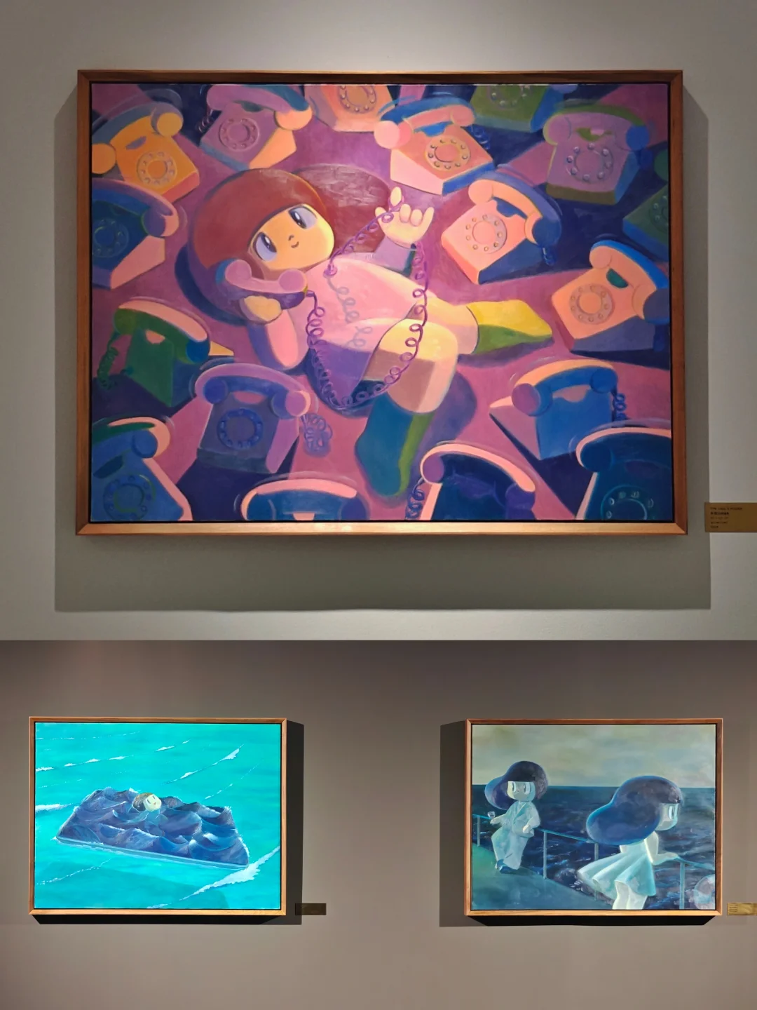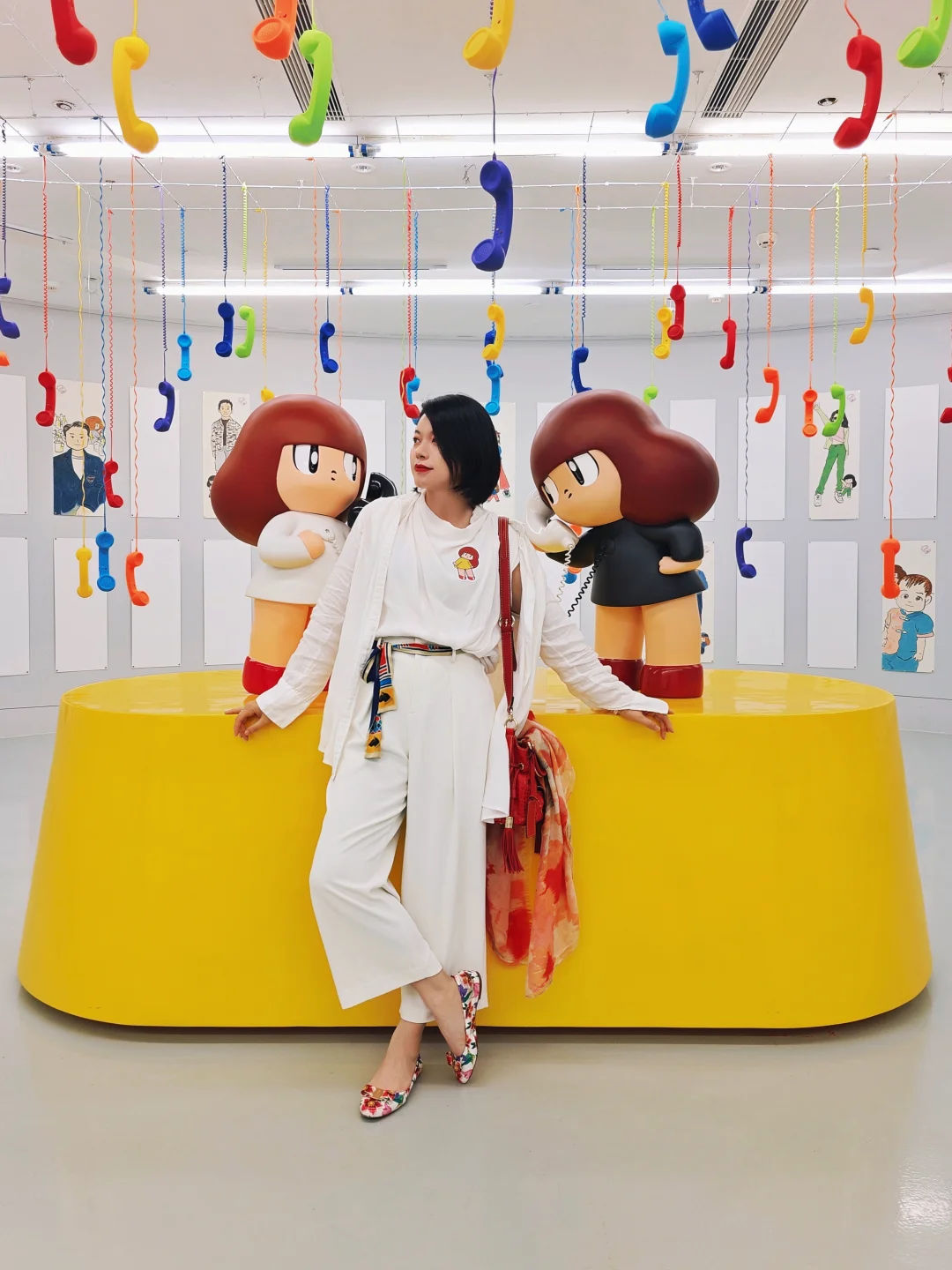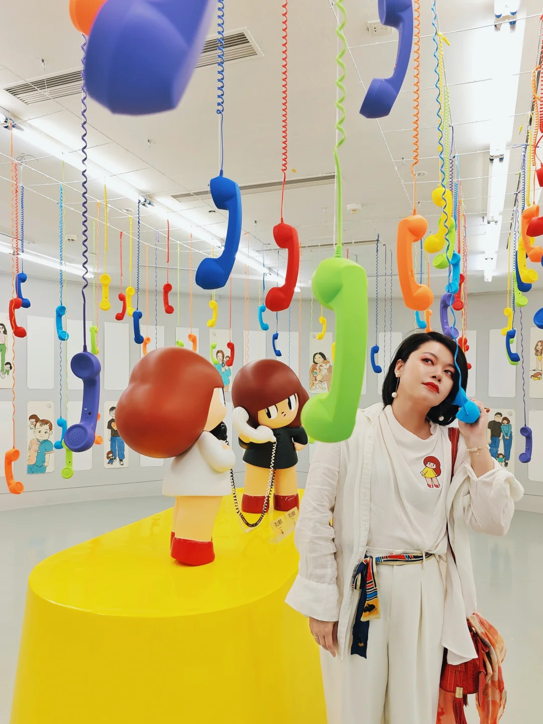 🖼️第二展区是白色空间,中间有一个传声筒装置是必打卡的拍摄点。左侧巨幅绘画背后的空间是蕞大亮点,天花板上垂下五彩斑斓的听筒和中间的打电话的芒姆安雕塑形成一个特别装置,你不妨也来接个“我错过的来电”吧!周围一圈弧形墙上的空白画板是用于“定制绘画”,观众可以付费请艺术家亲自执笔绘制自己和🥭妹妹同框的艺术肖像。