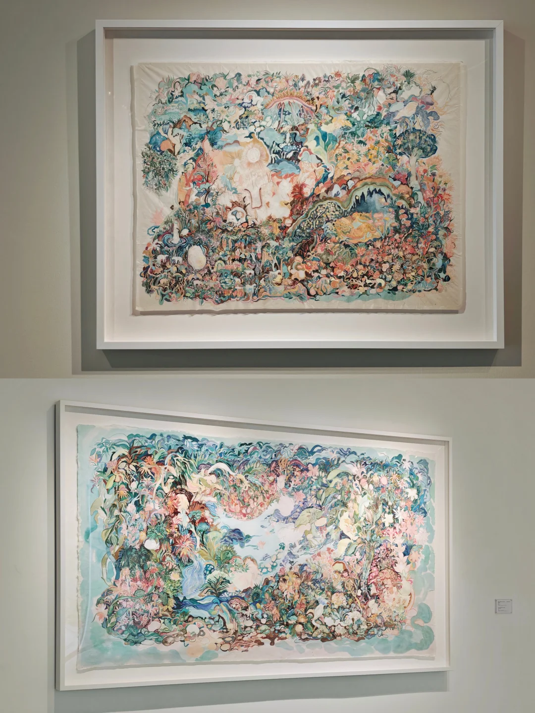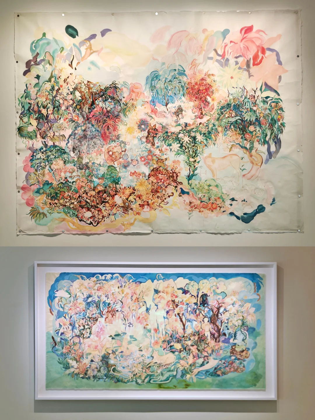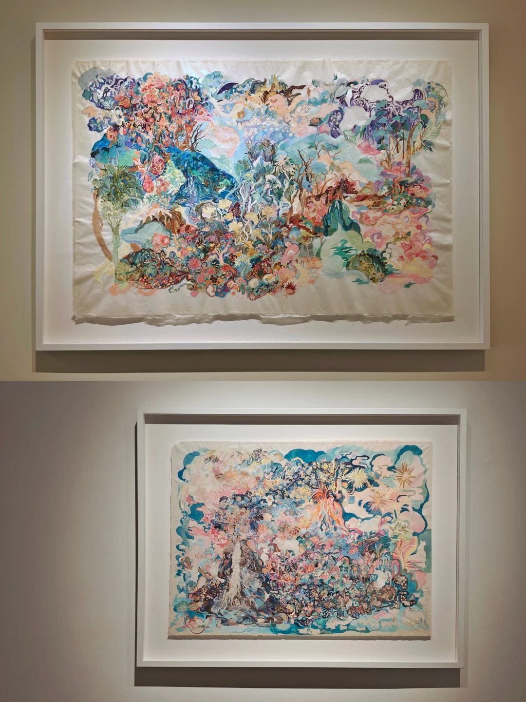 👉前年在杜梦堂看过这位艺术的首展,这次是第二次展览,风格很独特,还是很好认的。相比上次的偏冷色调,这一次画面的色调感觉更梦幻柔和了。