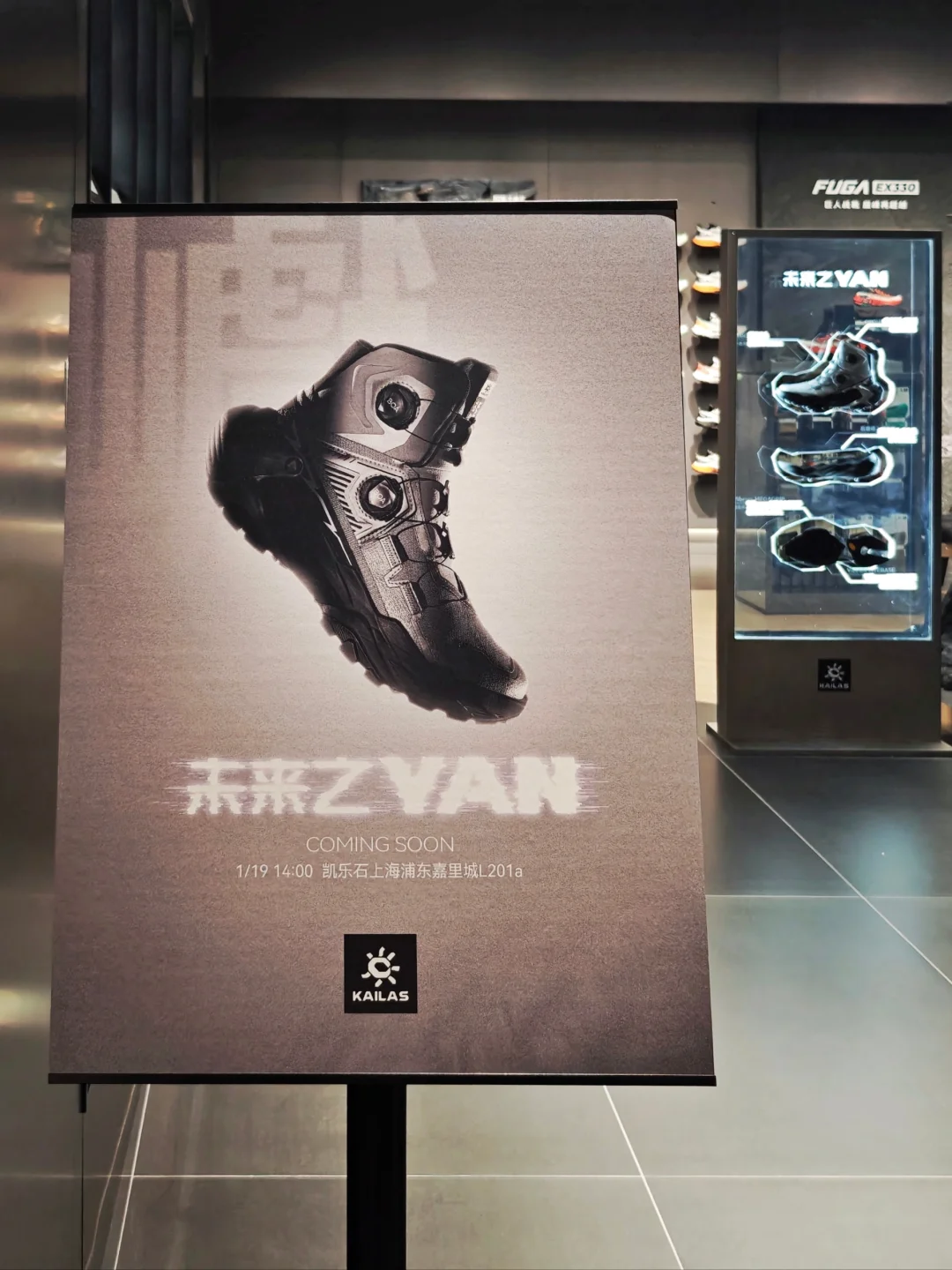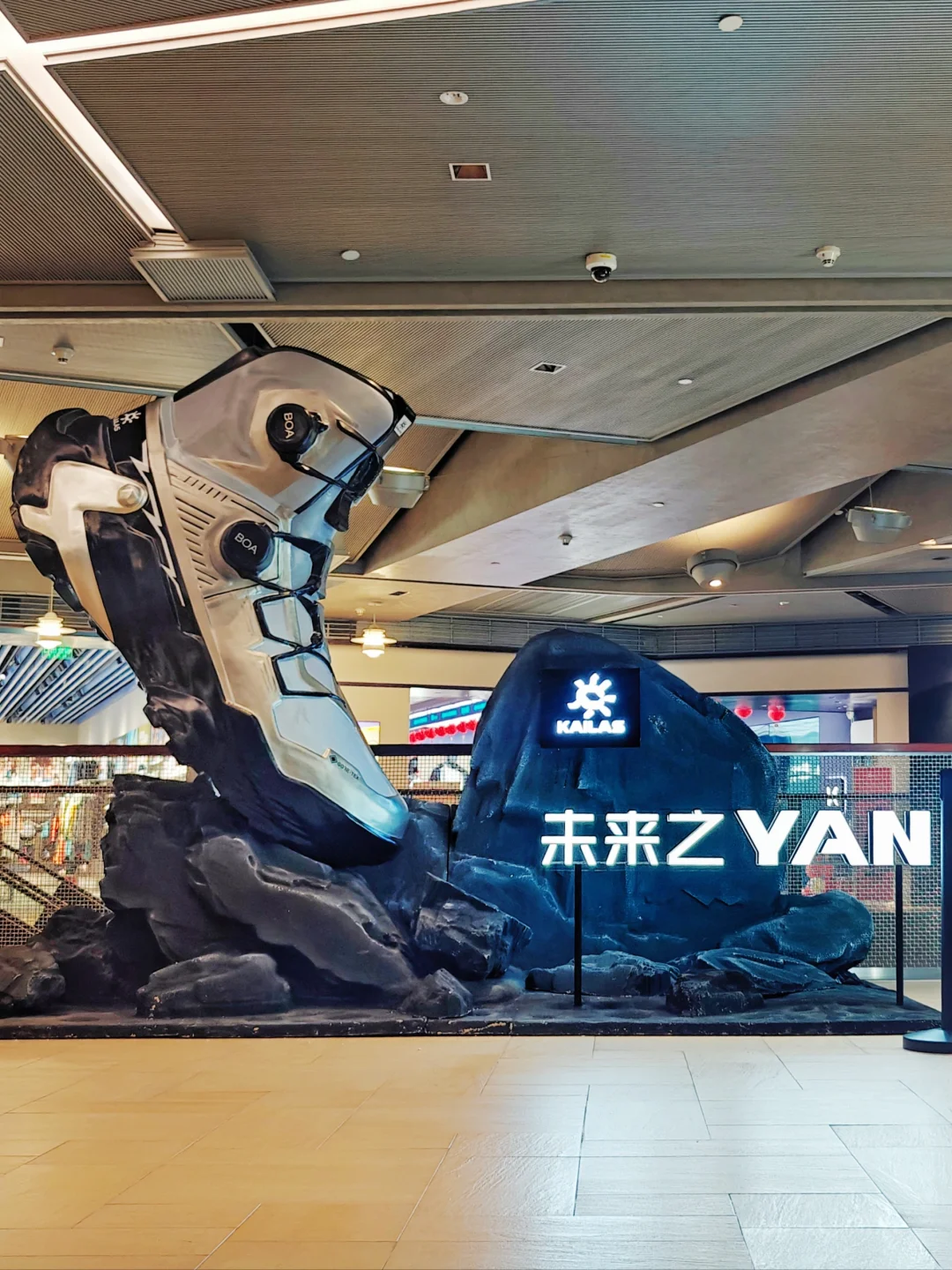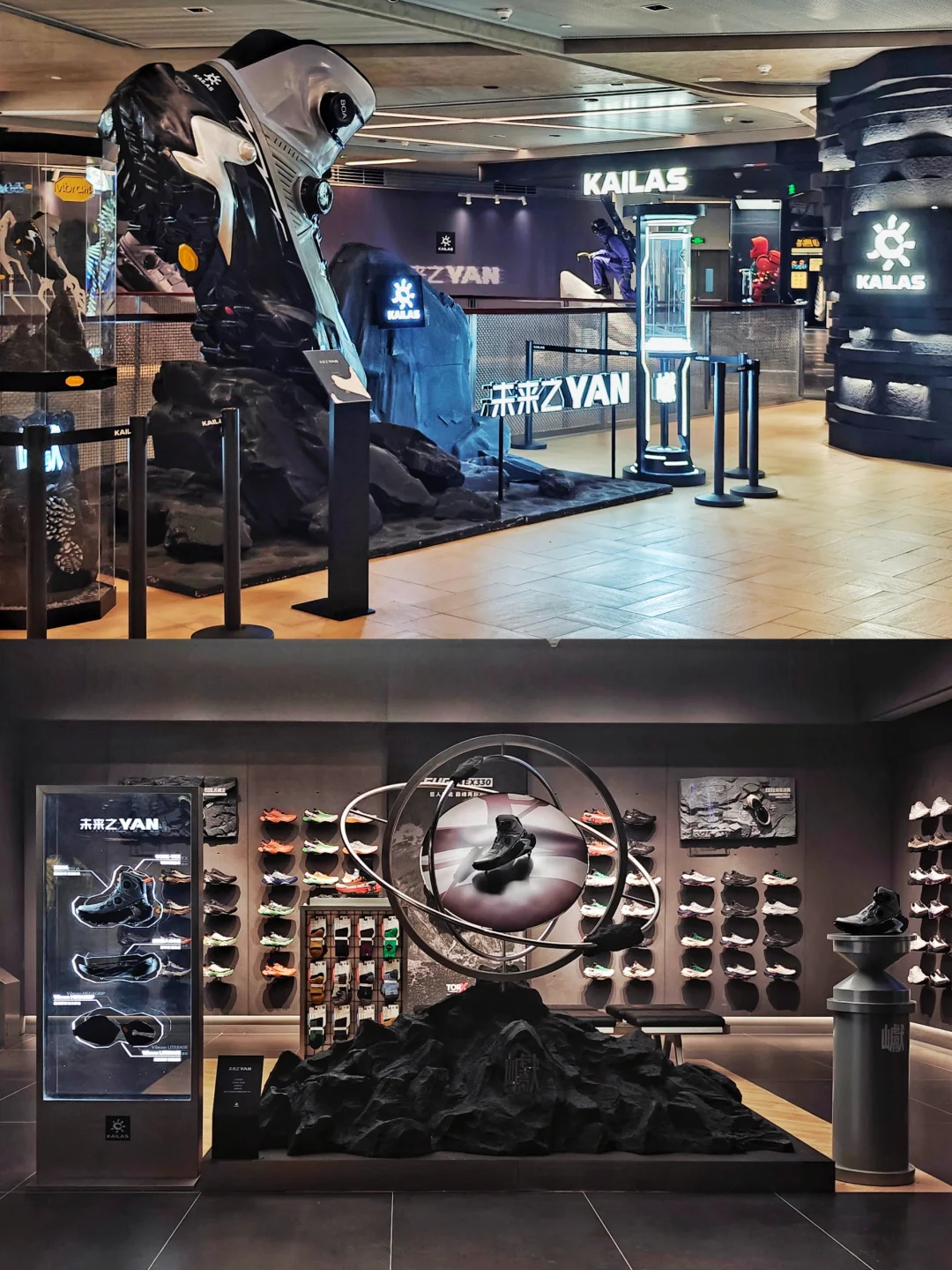👟一进门今天刚刚对外新发售的凯乐石YAN 主题是[未来之YAN],直接抓住我的眼球,未来感强烈,原来户外鞋也可以这么时尚,搭配都市日常穿着也很亮眼。打破了我脑海里对于徒步鞋的印象,鞋身是银黑配色,线条流畅分明,有层次感,店内装置整体是未来机械风。店员也很热情,介绍了YAN的性能,了解之后发现真是时尚和专业兼具的一双徒步鞋。