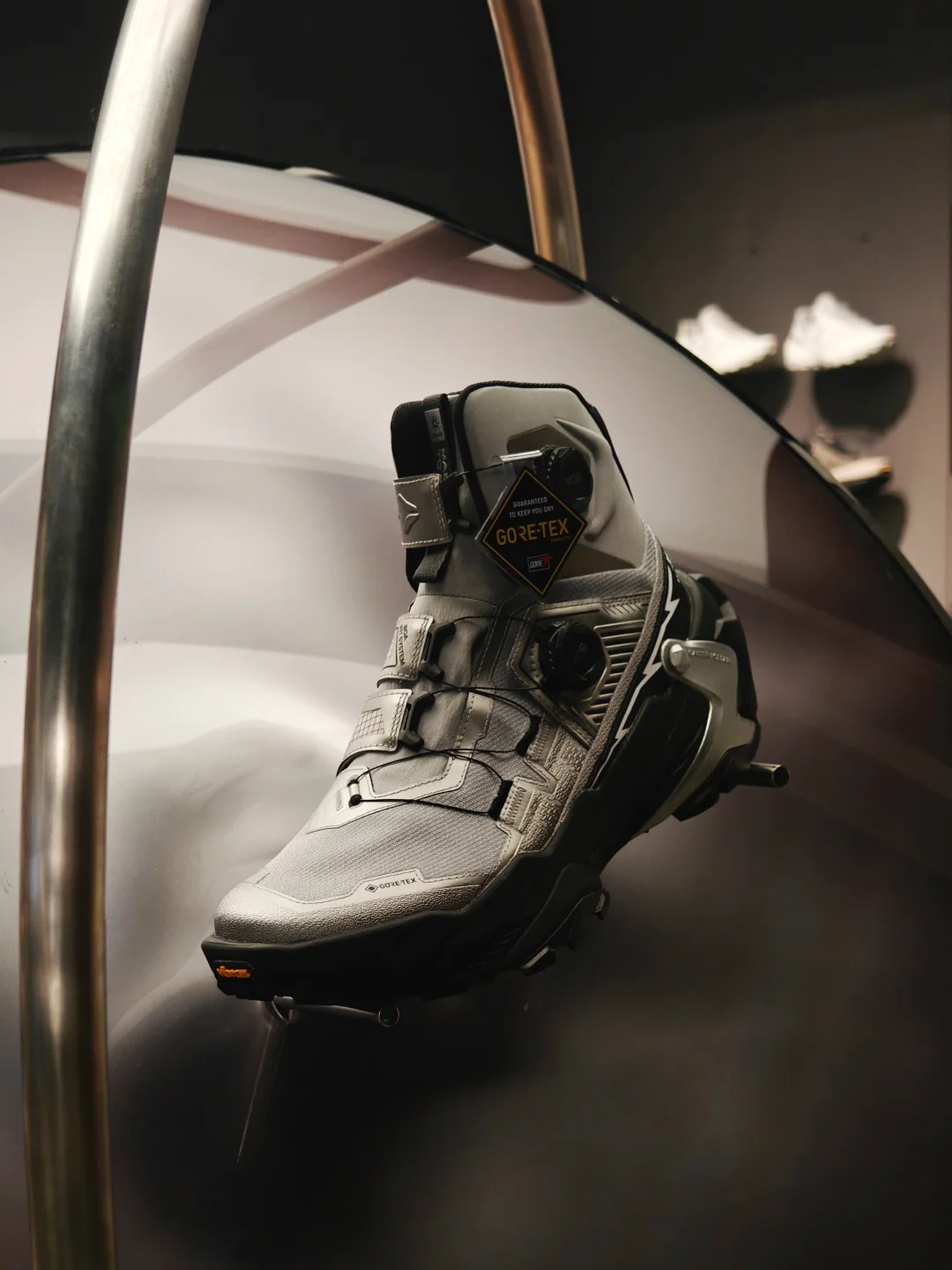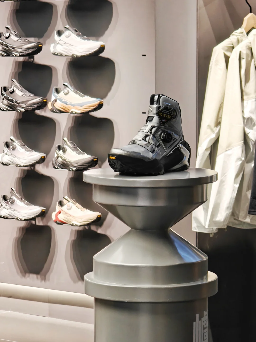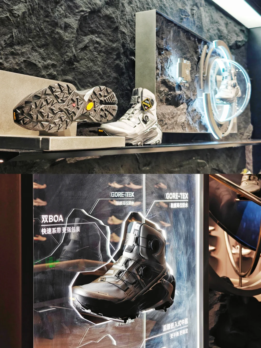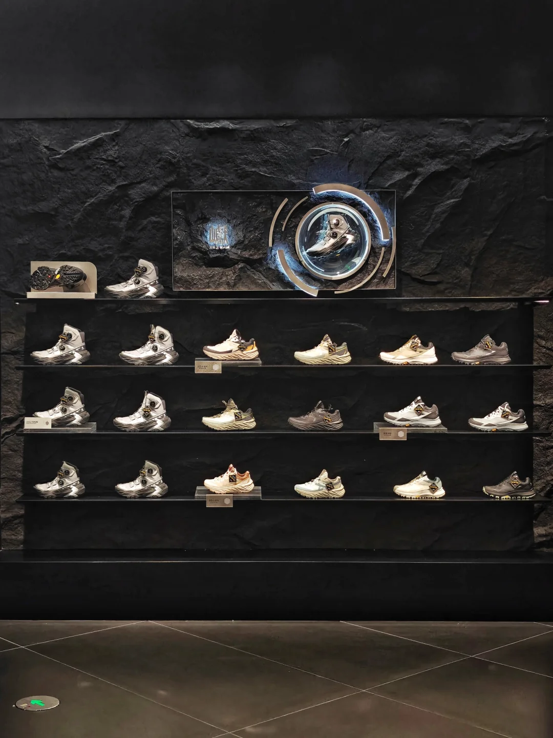 👟一进门今天刚刚对外新发售的凯乐石YAN 主题是[未来之YAN],直接抓住我的眼球,未来感强烈,原来户外鞋也可以这么时尚,搭配都市日常穿着也很亮眼。打破了我脑海里对于徒步鞋的印象,鞋身是银黑配色,线条流畅分明,有层次感,店内装置整体是未来机械风。店员也很热情,介绍了YAN的性能,了解之后发现真是时尚和专业兼具的一双徒步鞋。