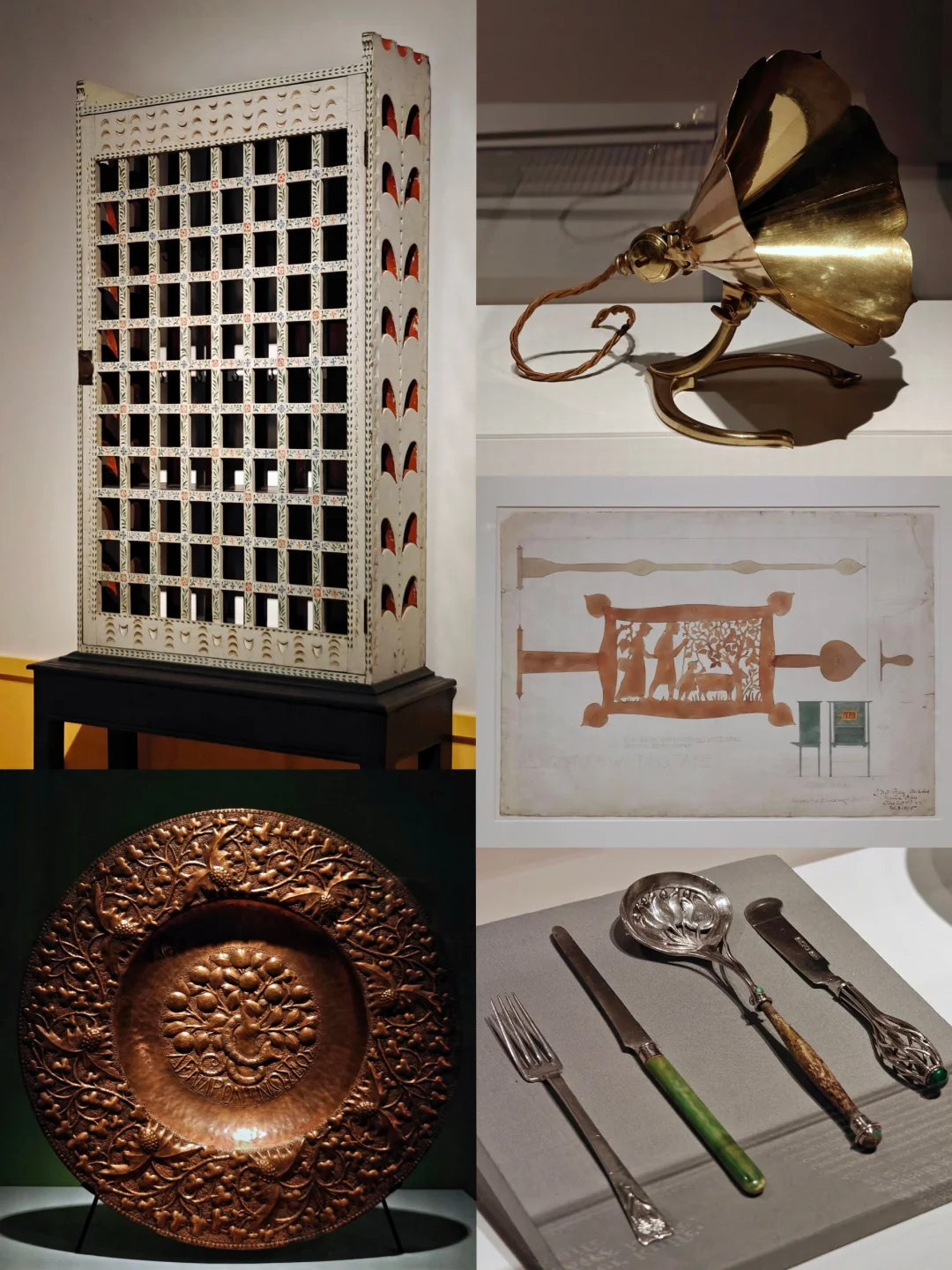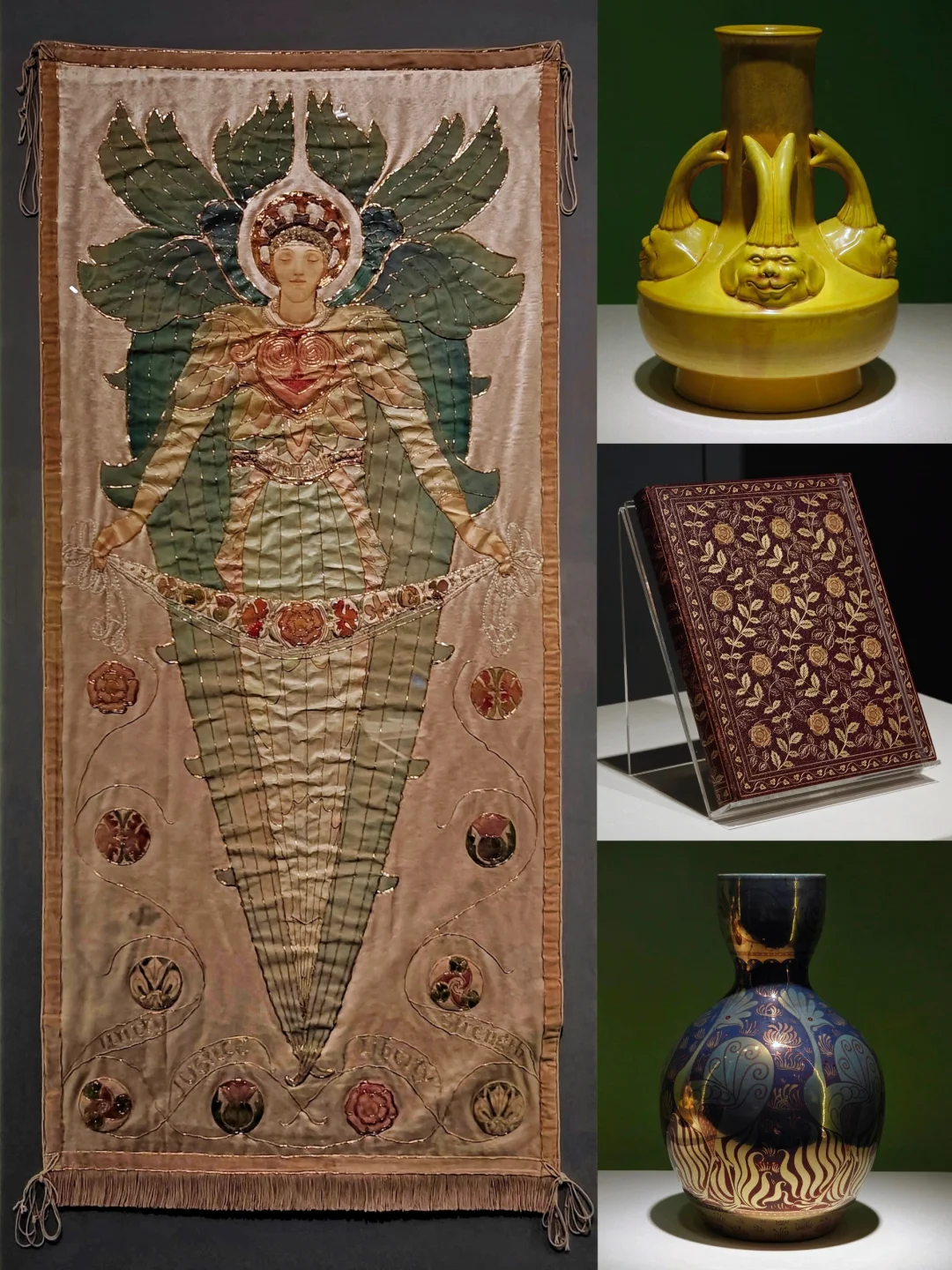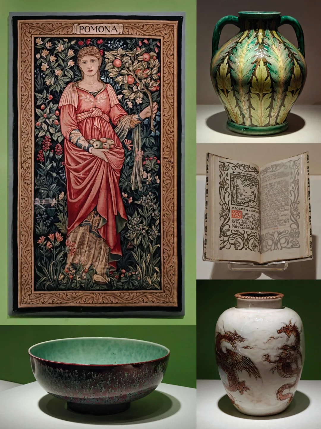 🖼️这一时期陶瓷设计深受中国、日本风格影响,注重纹饰。印刷和书籍装帧主要两种风格:模仿手抄本的古典风的和清新的儿童读物。彩色玻璃产品结合哥特风创新,增加人文主义气息。这些在展览中均有展现
