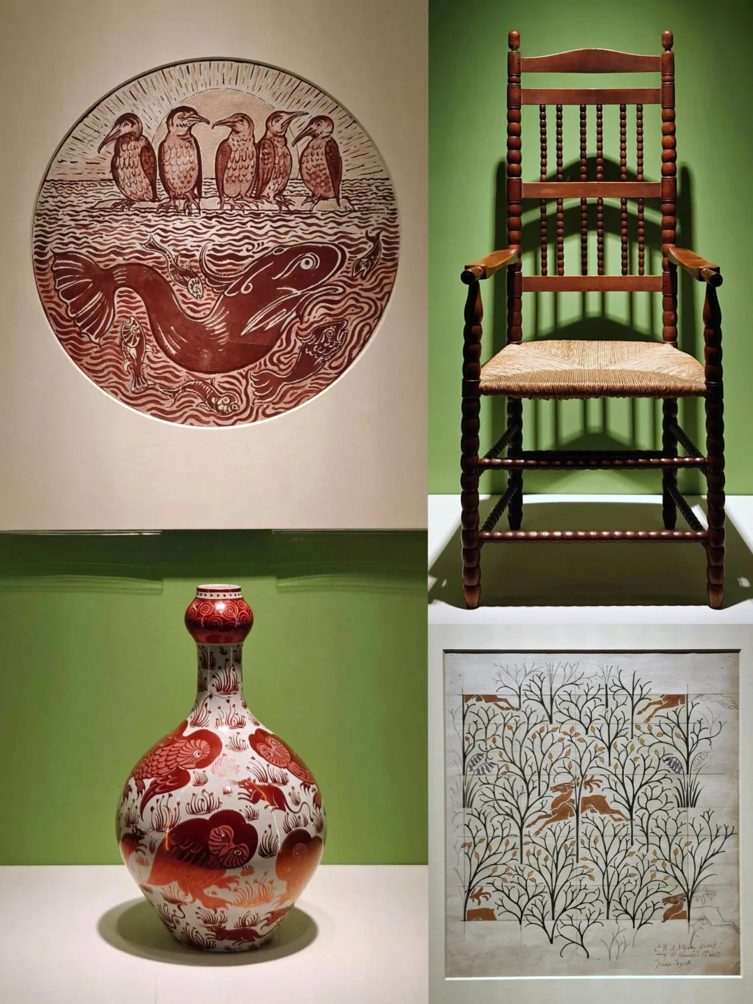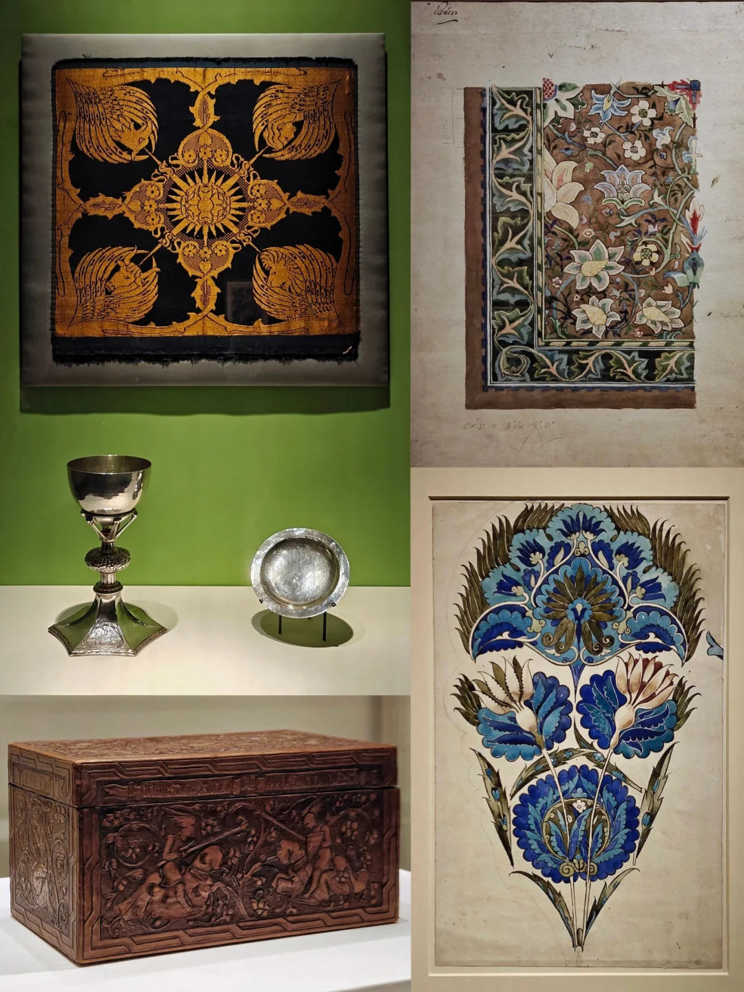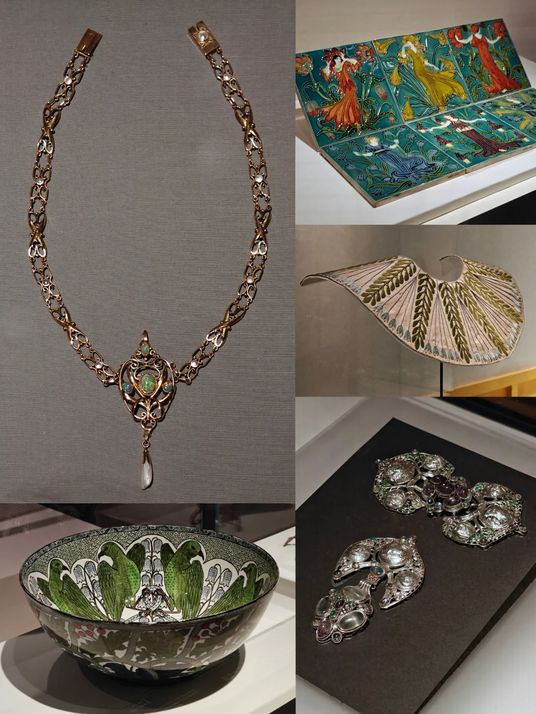 🖼️这一时期陶瓷设计深受中国、日本风格影响,注重纹饰。印刷和书籍装帧主要两种风格:模仿手抄本的古典风的和清新的儿童读物。彩色玻璃产品结合哥特风创新,增加人文主义气息。这些在展览中均有展现