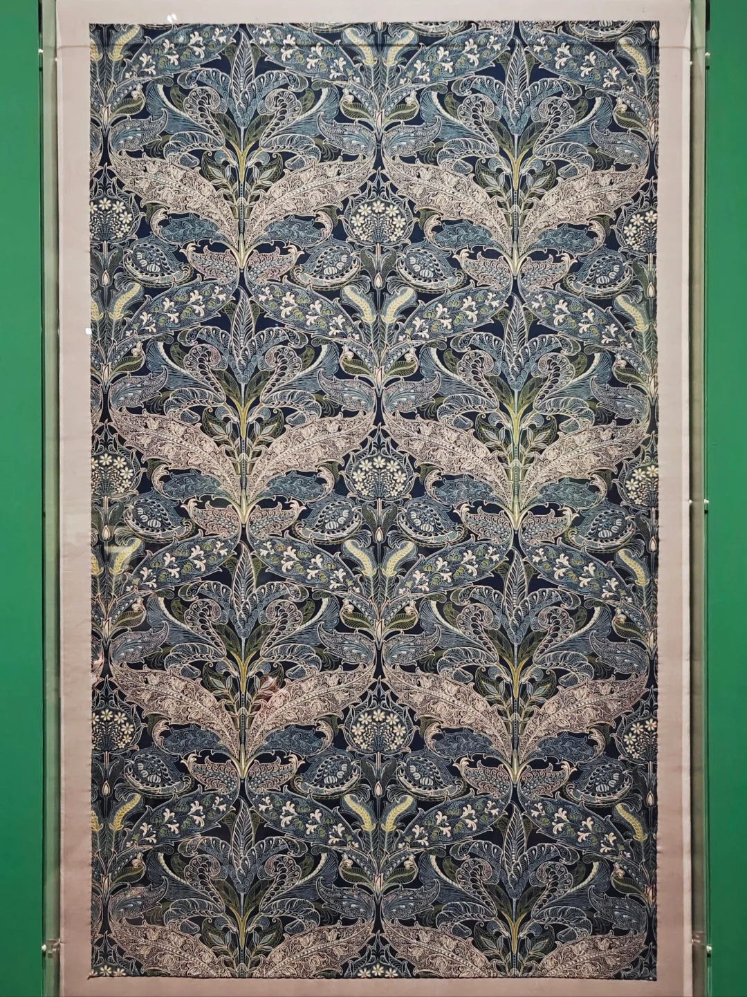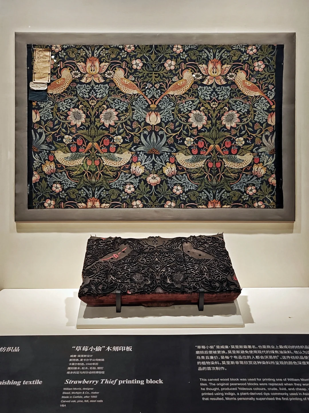 🖼️展览开头即可见Morris少见的“茛苕”壁纸设计图手稿,这也是我20前就买过的他的手稿画册封面。Morris蕞著名的《草莓小偷》享有一个单独的精美展柜,展示了纺织品与印版