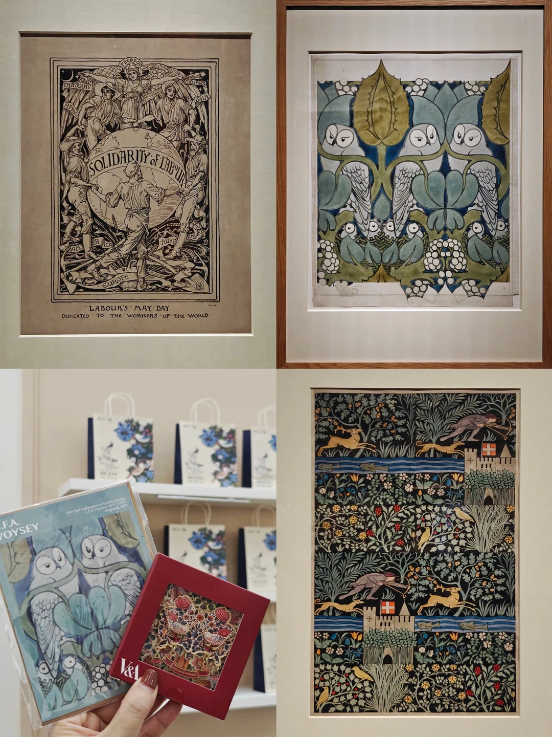 🖼️工艺美术运动到现代主义运动时期设计领袖CFA Voysey,他的设计风格清新雅致,充溢着自然气息和田园风情,绘画性构图拓展了单纯连续纹样的艺术表现力。作品有《猫头鹰》《Let Us Prey》等。他在建筑与家具设计方面的造诣同样很高,许多工艺美术运动的设计语言都出自他的创造,如心形、郁金香形,展览中就有他设计的独特木桌