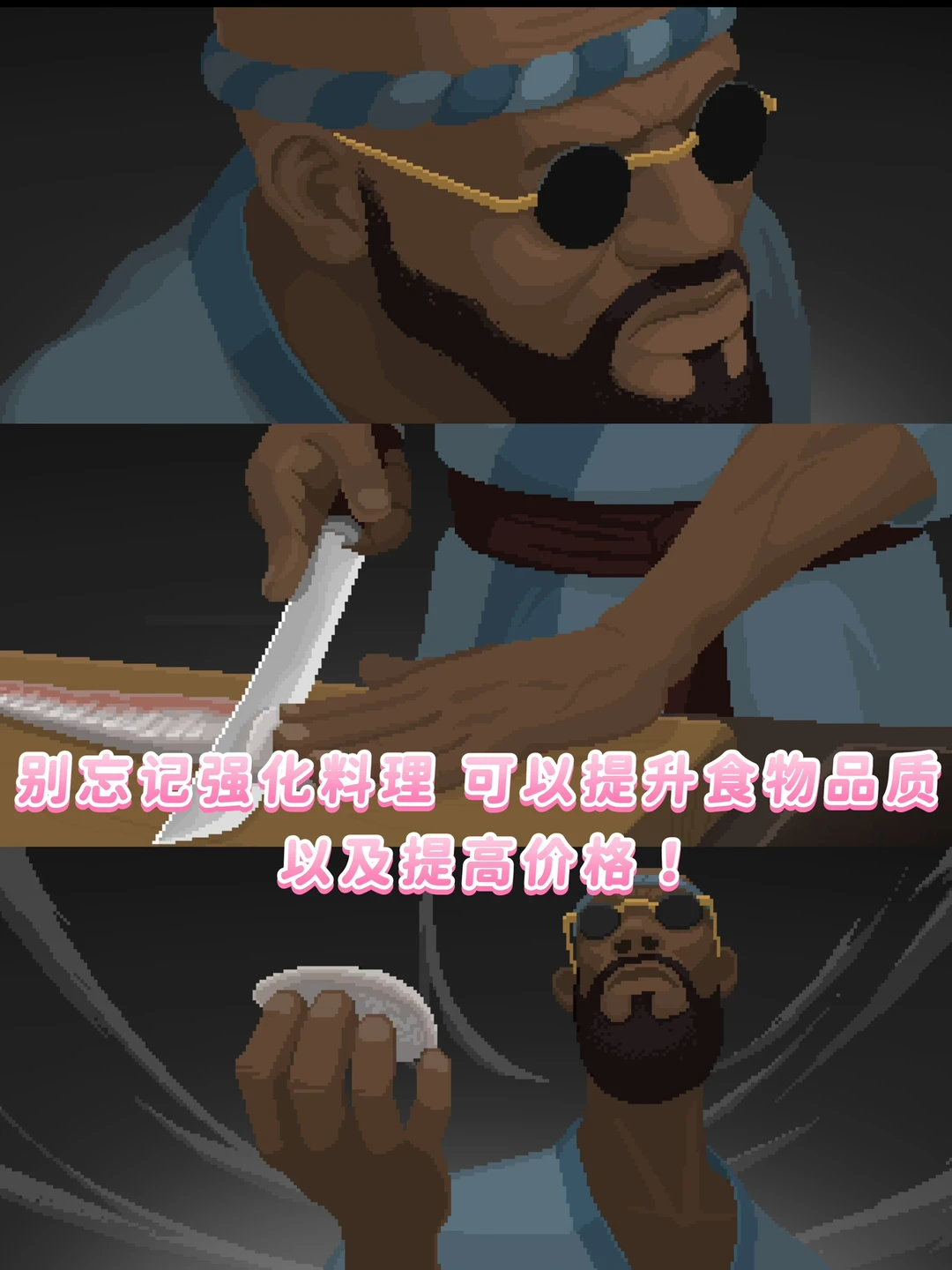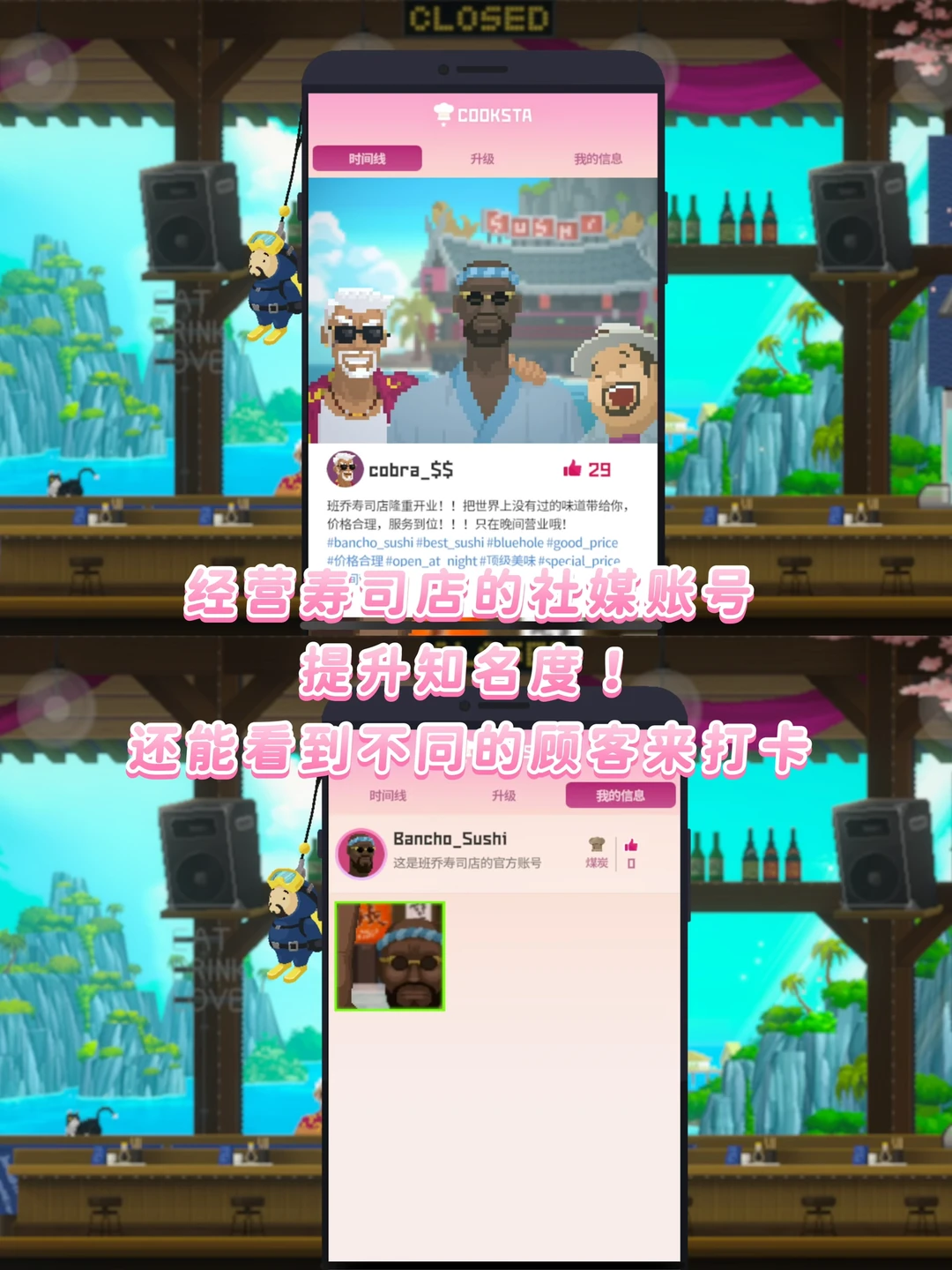 白天下海探索蓝洞,抓不同类型的🐟、收集资源,磨练你的捕鱼技巧;晚上经营深夜寿司店,用当天捕到的新鲜食材赚钱升级装备。潜水是为了开店,开店是为了潜得更深,这个循环特别容易让人沉浸。不知不觉就玩了好几个小时,却一点不累~