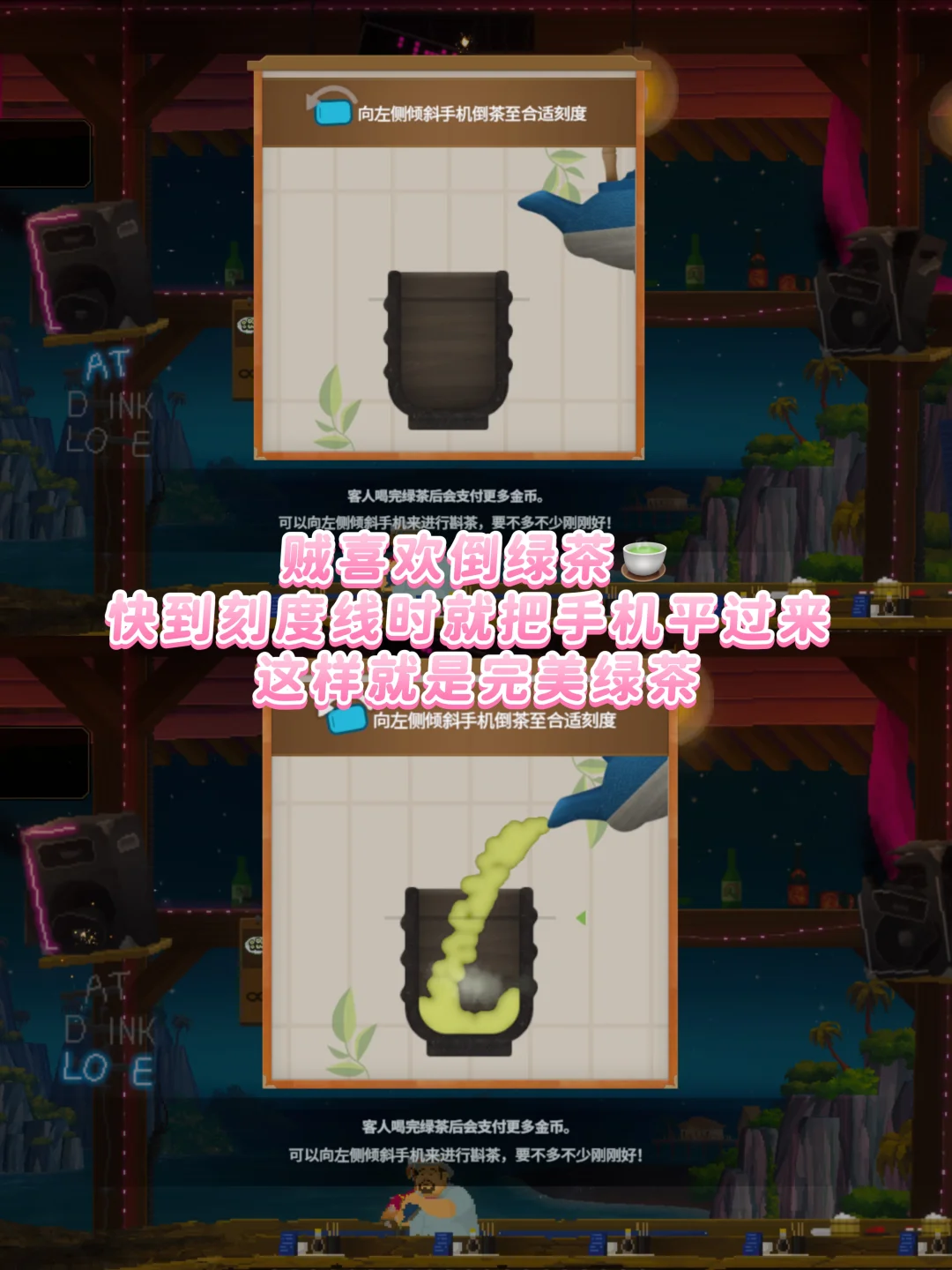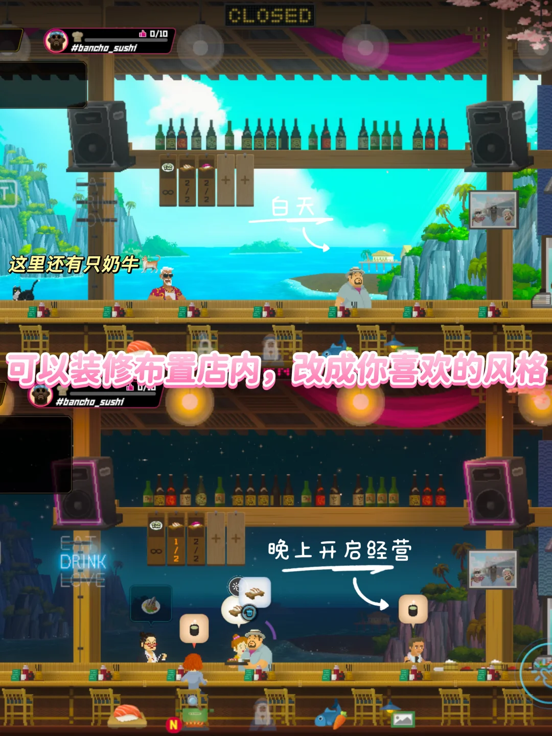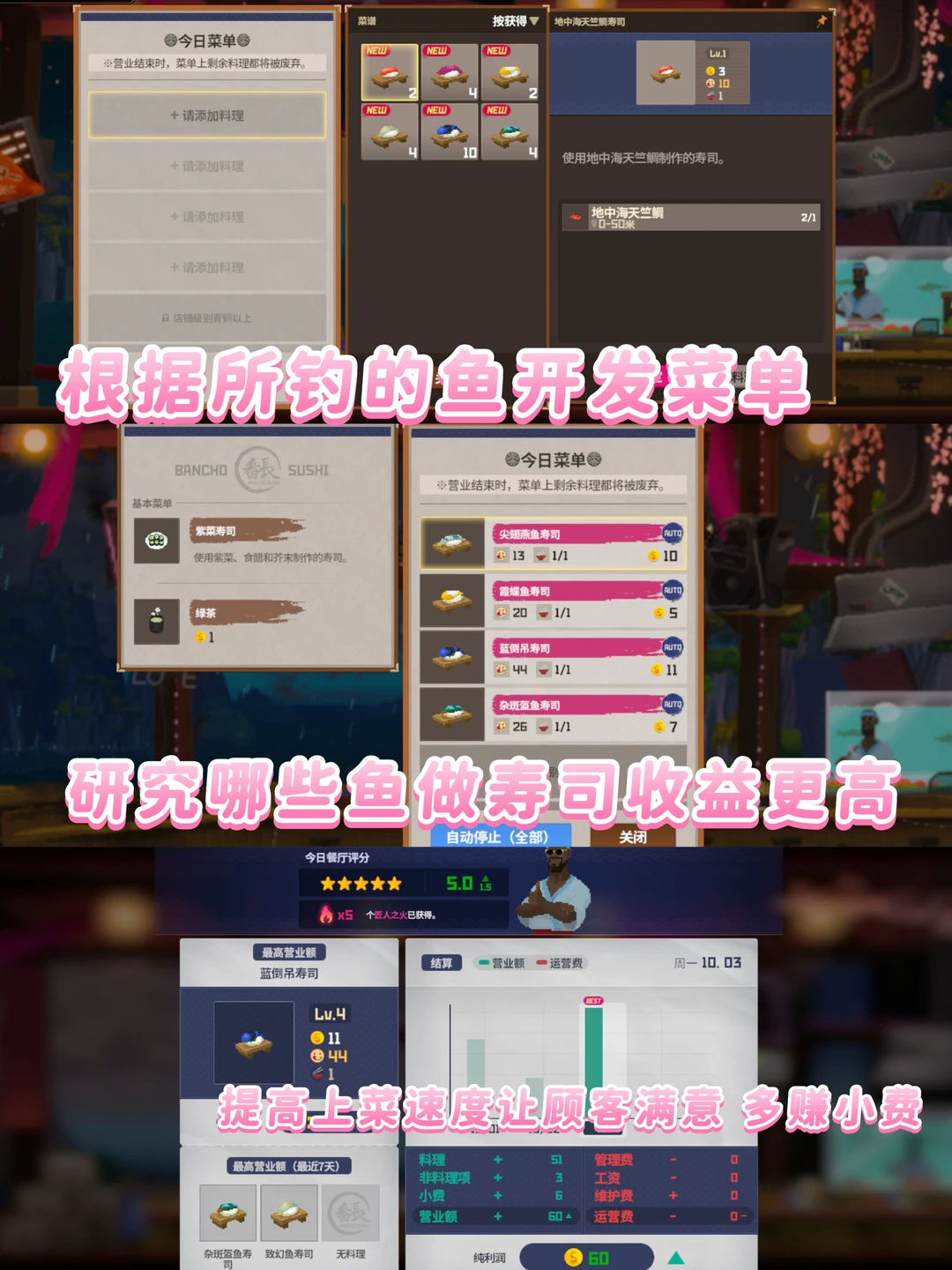 🍣最喜欢经营寿司店的玩法。不会手忙脚乱!还能装修店铺。准备菜单和倒茶倒酒的玩法也很有意思,很考验耐心~